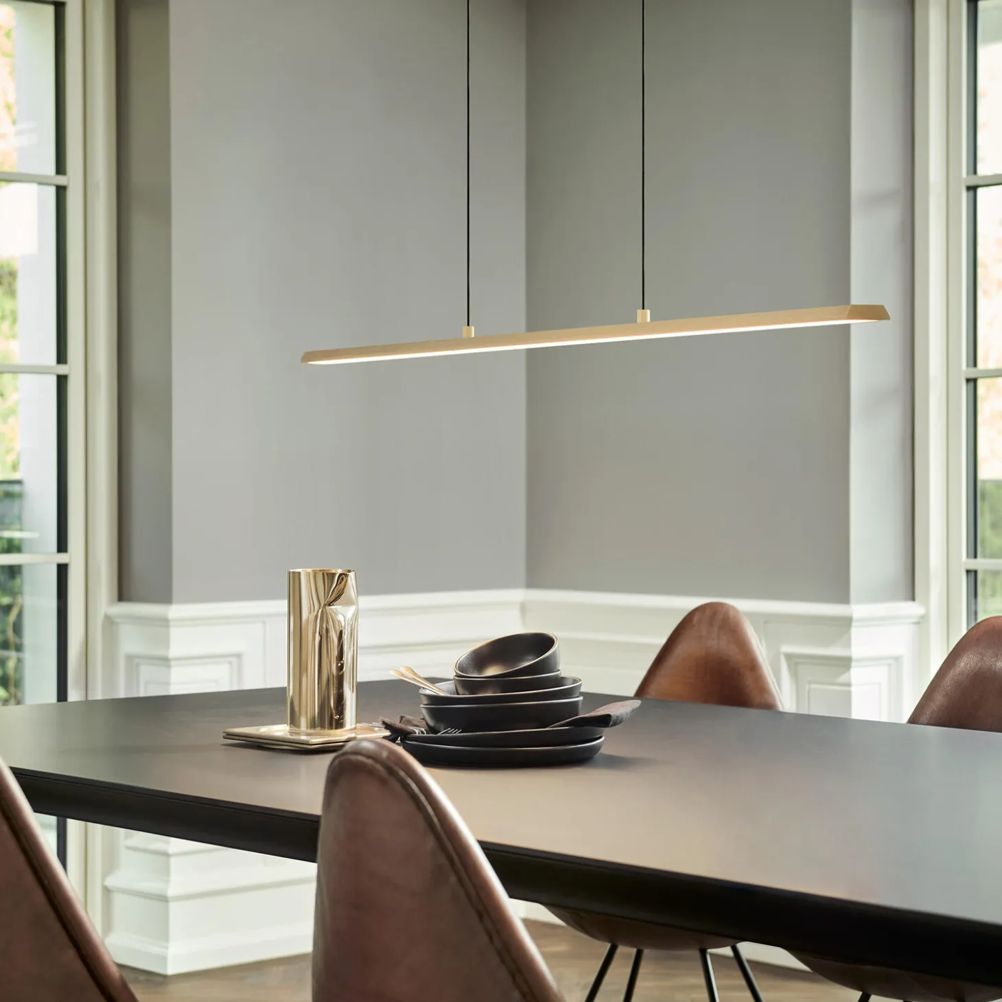 SLIM er en elegant, diskret og effektiv lyskilde, der er ideel til brug over spise- eller mødeborde, med et beslag, der ikke er andet end en næsten usynlig linje i luften. Den kaster effektivt et blødt, varmt og diffust lys over bordet. SLIM leder tankerne hen på en trapez, der hænger over bordet og holdes oppe af to tynde stofkabler. Armaturet, som fås i flere farver, er kun 1 cm tykt og 5 cm bredt. Det fås i tre længder – 120 cm, 150 cm og imponerende 180 cm. Med to indbyggede farvetemperaturer kan du vælge mellem 2700K og 3000K ved hjælp af kontakten i installationsbasen. Armaturet, der er udført i aluminium, forstyrrer ikke udsigten gennem vindues- eller dørpartier nævneværdigt. Det giver ro til øjnene, og armaturet er samtidig udstyret med den bedste og mest kompakte LED-teknologi.