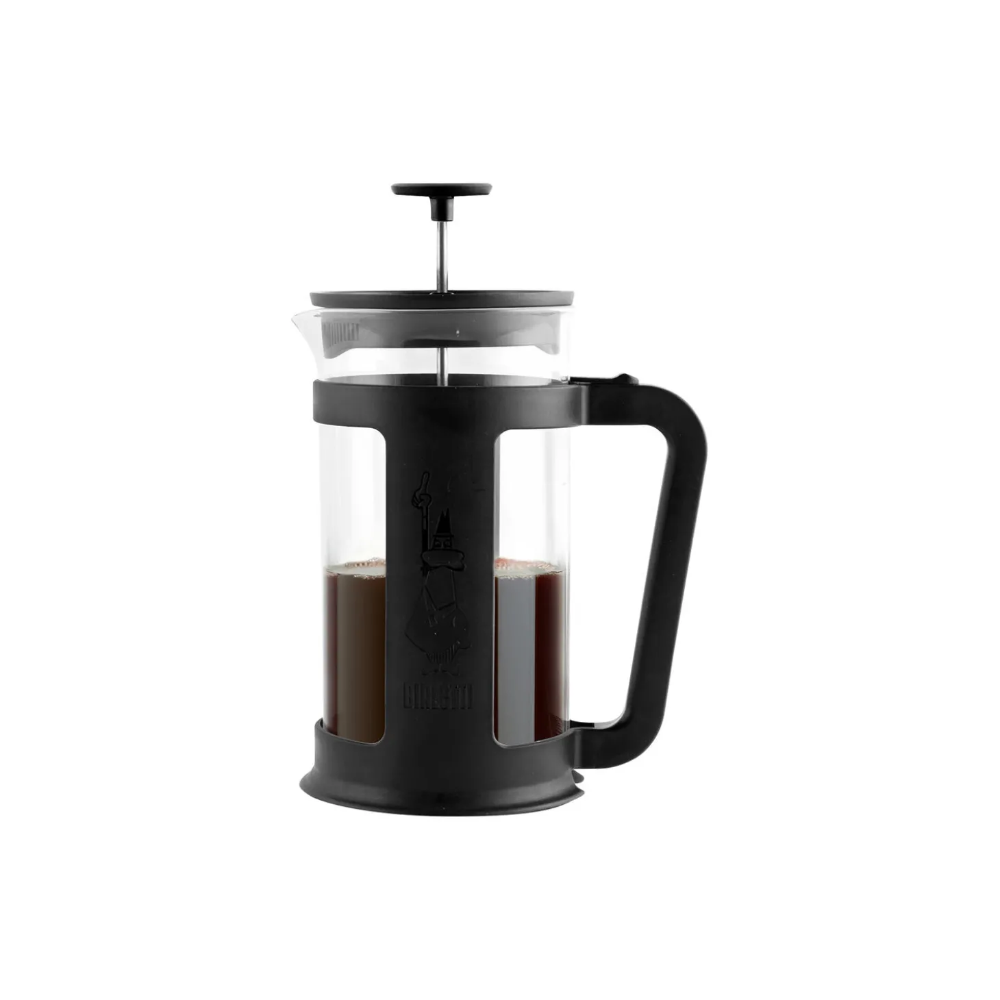 Kaffepresse til tilberedning af lækker filterkaffe, te og urtete. Moderne styling og glaskrop med specialtrykt logo. Låg og håndtag i plast og silikoneunderlag i to livlige farver. Beholder af glas.