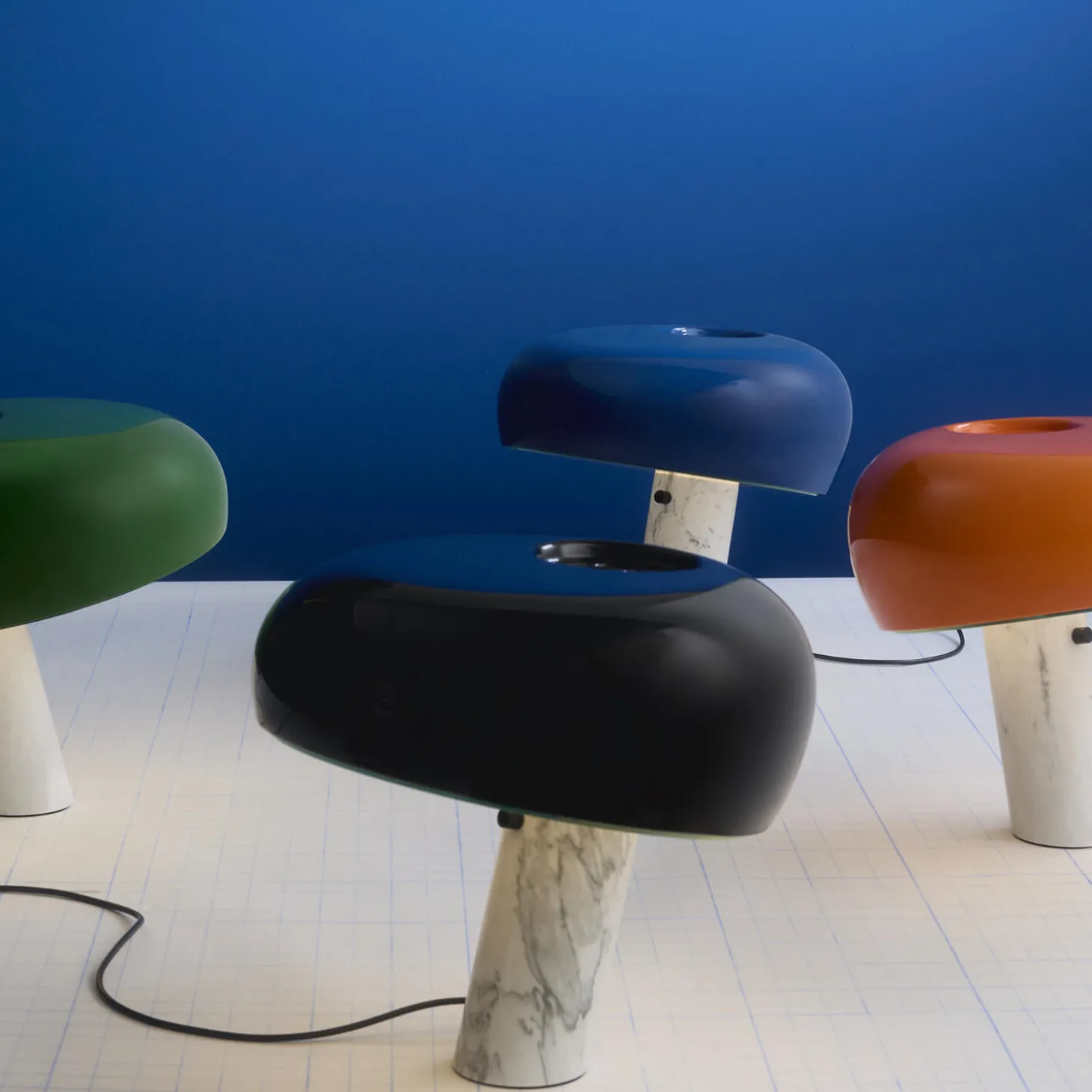 - Materiale: skærm i emaljebelagt metal og klart glas med base i poleret marmor