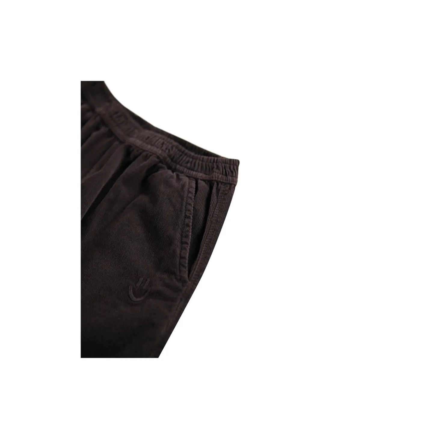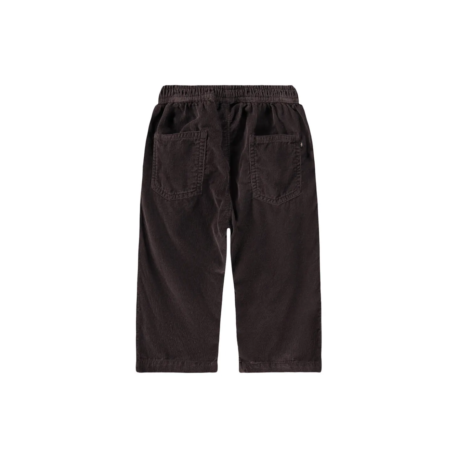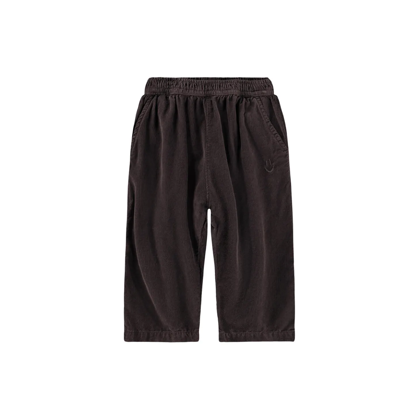 Disse fløjlsbukser er lavet i økologisk bomuld. Bukserne har en løs pasform med for- og baglommer samt en elastisk talje. Ved lommen finder du et lille broderet smilende ansigt.