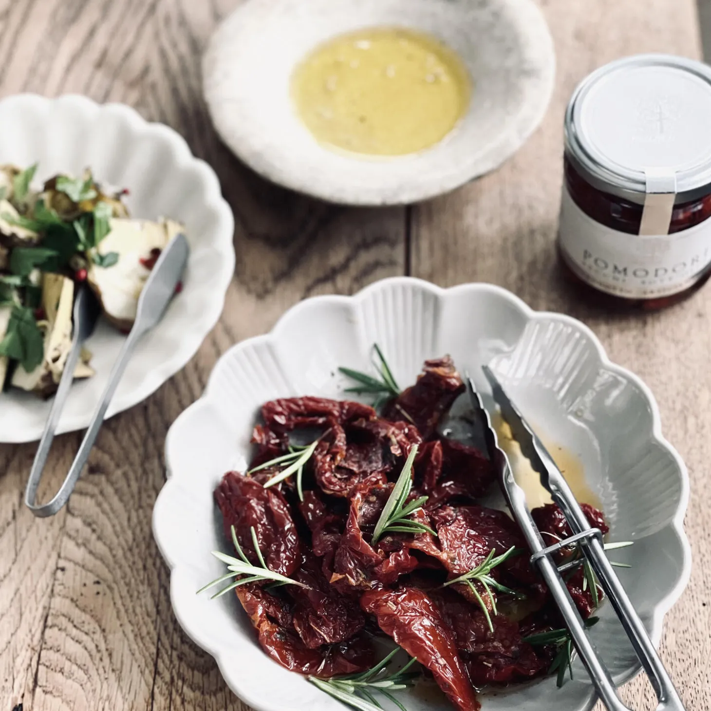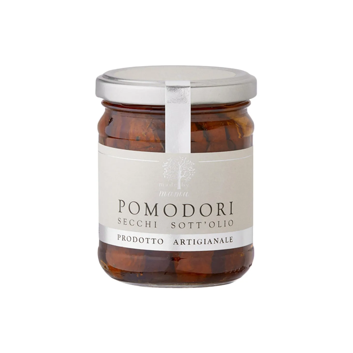 Made by Mamas soltørrede tomater smager af solens varme. De har en dyb og intens tomatsmag, der både er et lækkert element på et antipastibord og som også kan skabe dybde i en pastaret. Tomaterne ligger i en lækker krydderolie af ekstra jomfruolivenolie, persille, rosmarin, oregano og chili.