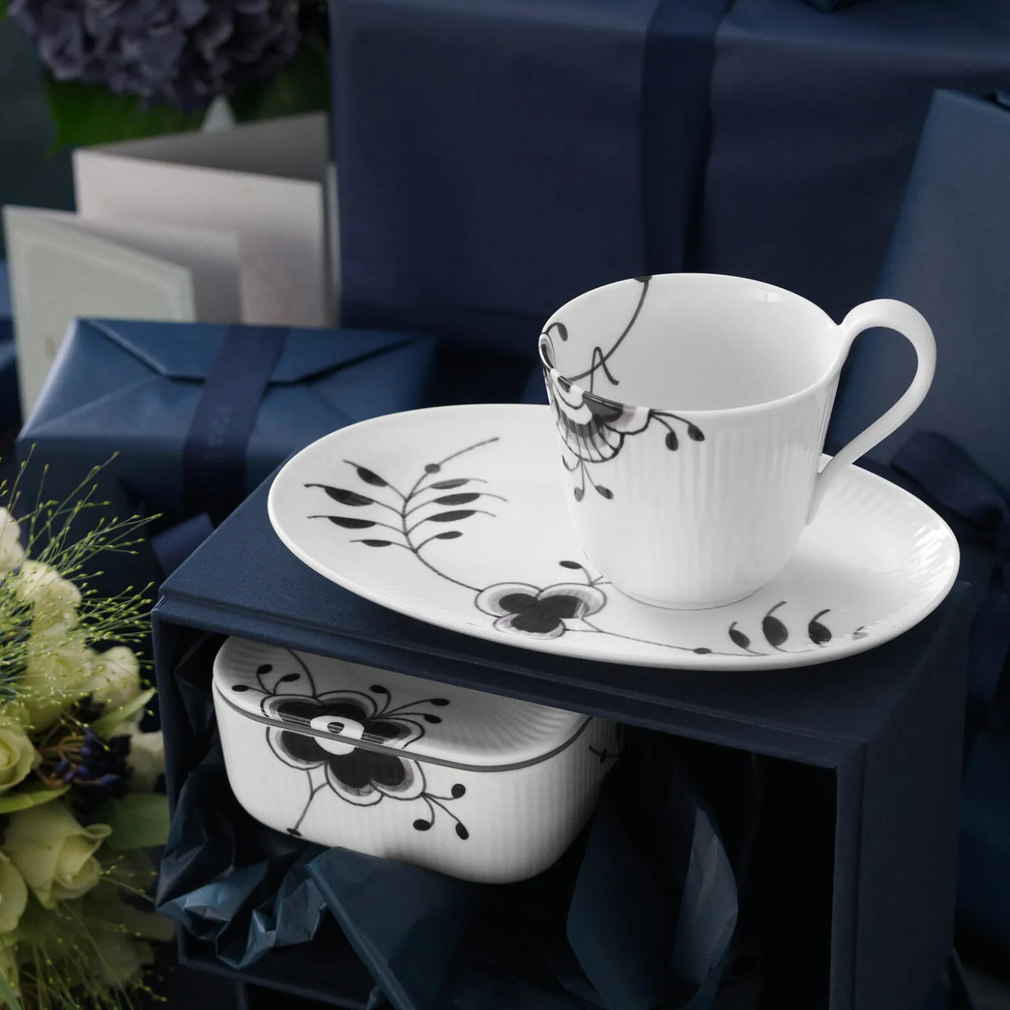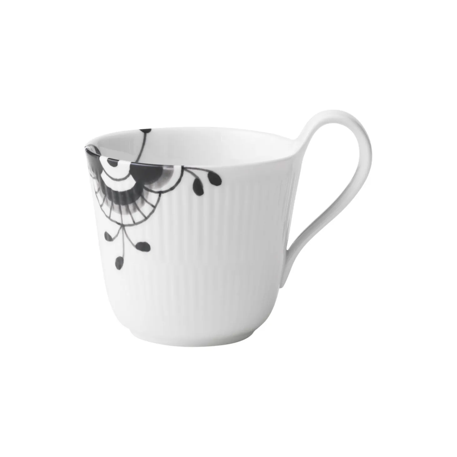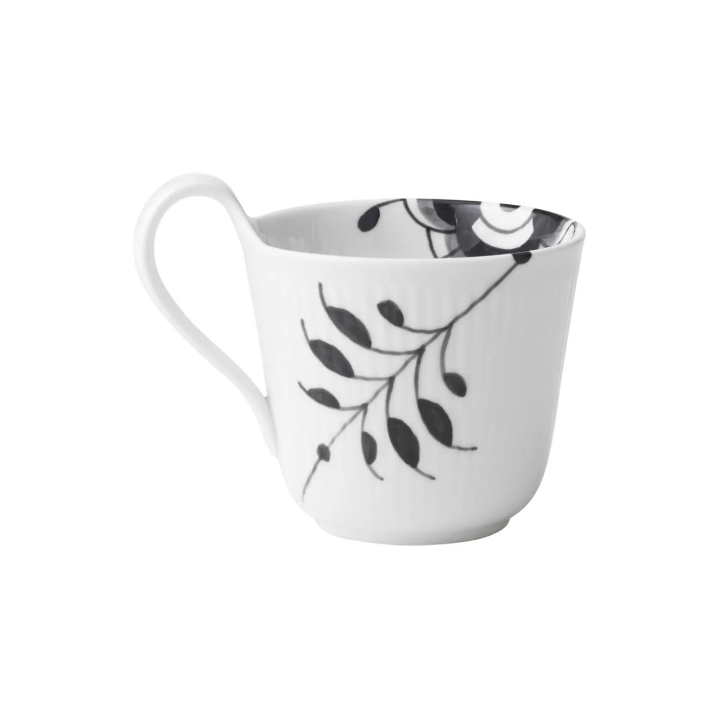Sort Mega Riflet højhankskop i porcelæn fra Royal Copenhagen. Denne Sort Mega Riflet Højhankskop prydes af to håndmalede elementer i form af en palmette og krysantemum, der i deres monokrome enkelthed skaber et iøjefaldende udtryk mod det hvide porcelæn. Koppen på 33 cl er nyttig både som kaffekop og tekop.
