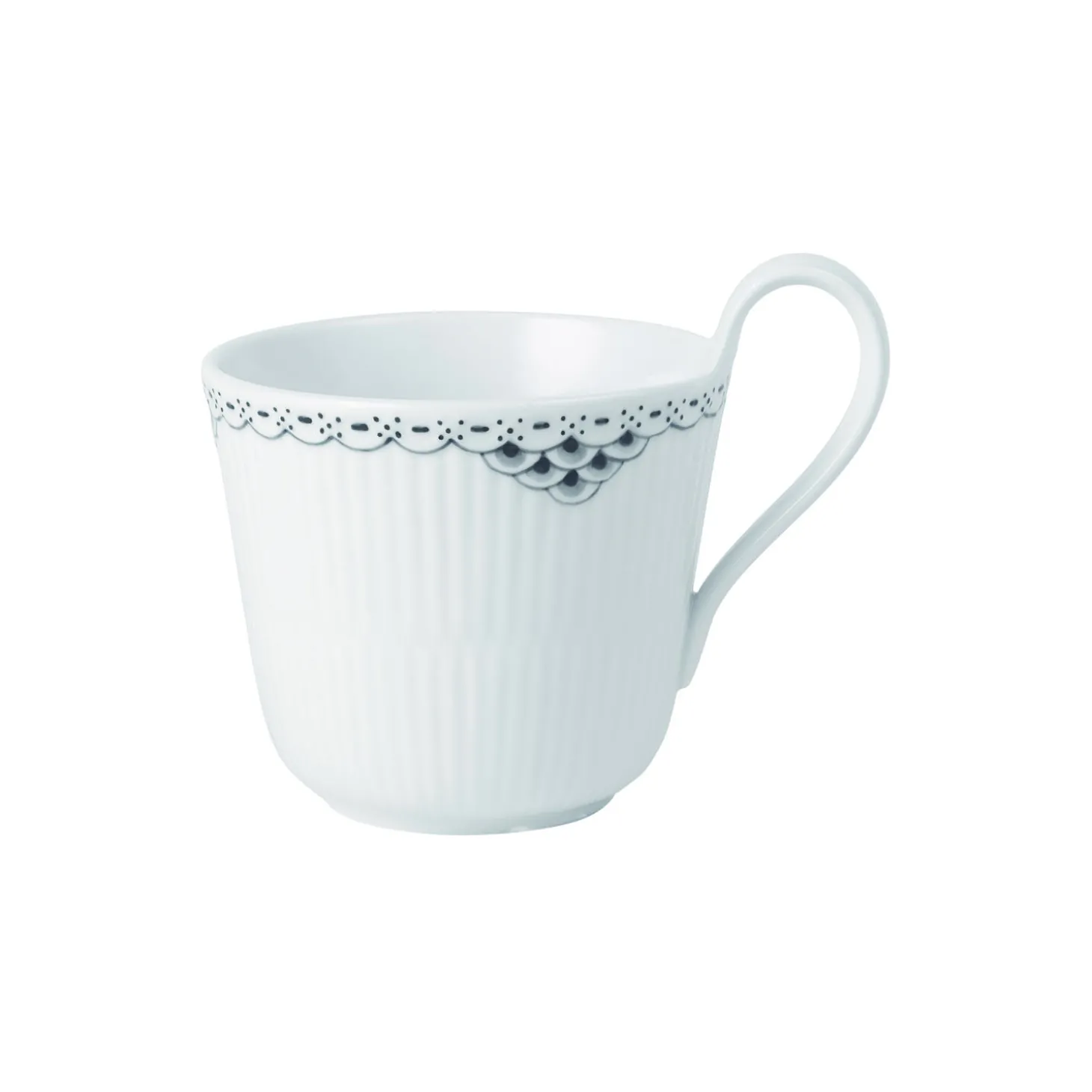 Højhankskoppen er en af Royal Copenhagens mest ikoniske kopper og er en elsket favorit til enhver kaffe- eller te-stund. Den karakteristiske høje hank gør koppen til en fornøjelse at holde, og den elegante, sorte blondedekoration løfter den klassiske kop til et nyt niveau af nutidig skønhed.