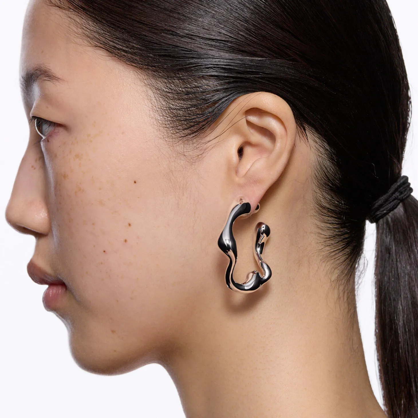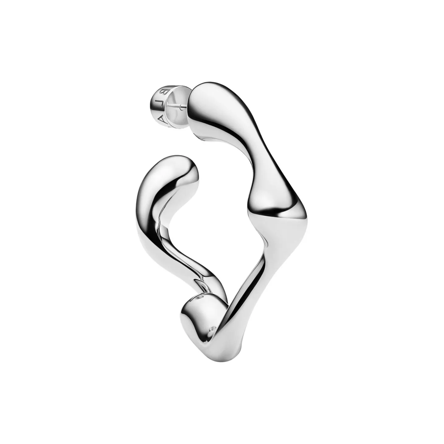 Designed in Denmark. Skilfully crafted in recycled sterling silver. Hoop earring designed in a harmonious flow of drop-like swirls. Nickel free and hypoallergenic. Hollow shaped design for lightweight wear. Large bullet back fastening for a luxurious fit. Available in left and right versions. Can be styled back to front.