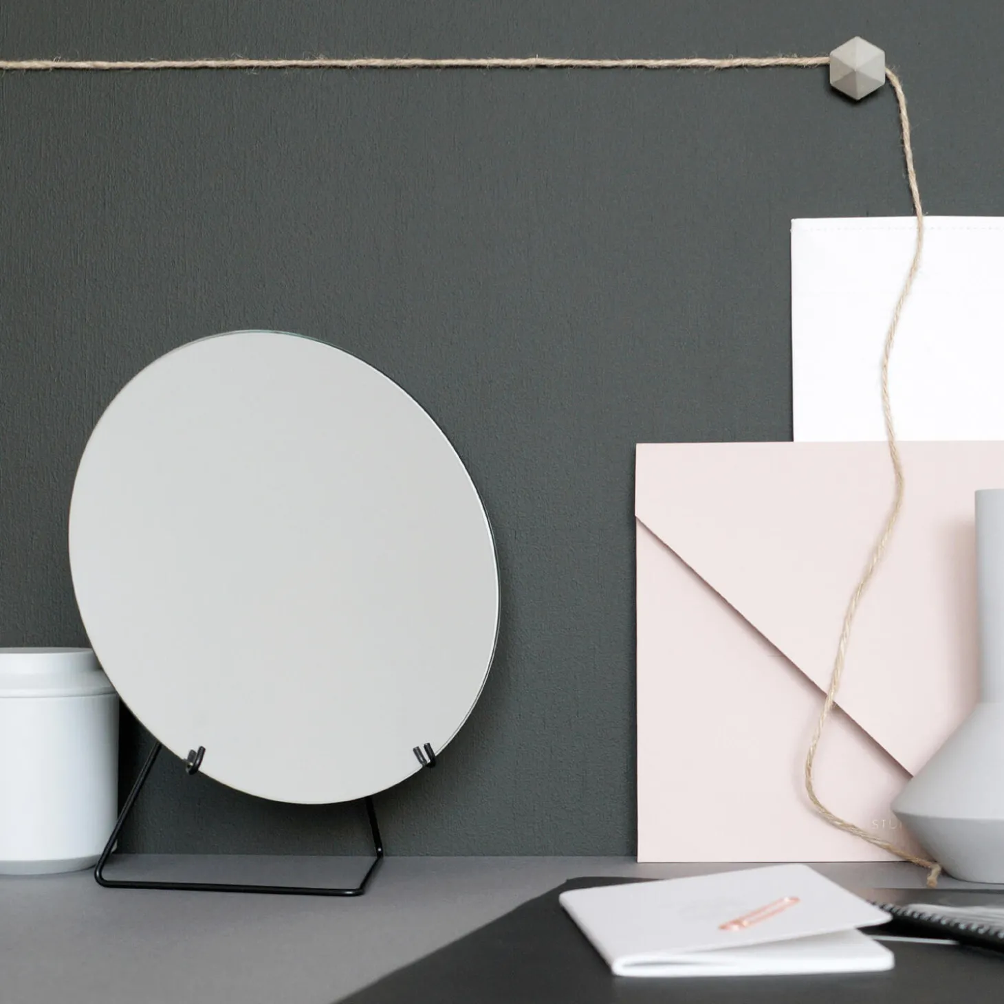 Standing Mirror is designed to sit on your table, shelf or cupboard with as as little nonsense as possible. Formed from a single piece of mirror glass held by a lightweight metal wireform. Available in Ø20 and Ø30.