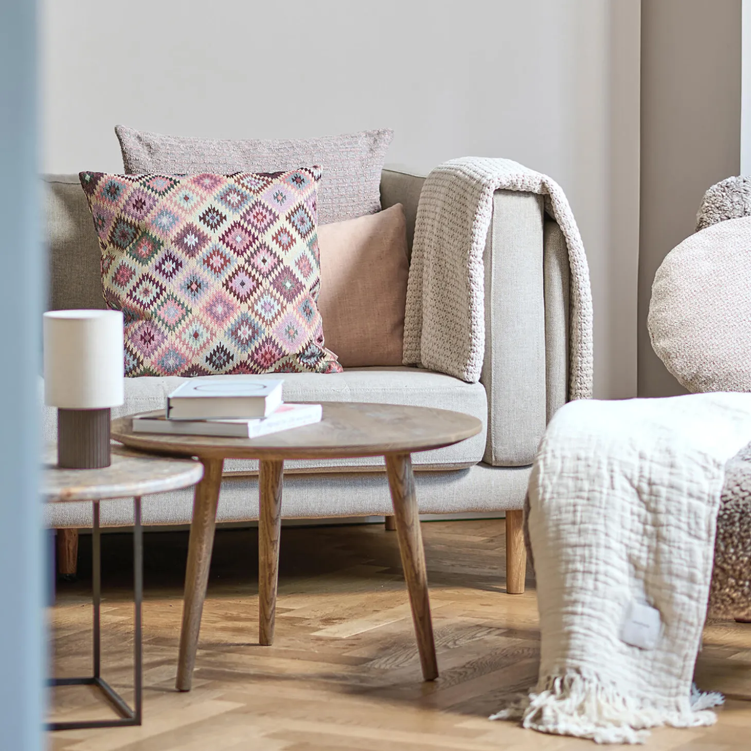En smuk rund pude i rosa, der med sit klassiske udtryk er perfekt til at skabe balance i et mix med andre strukturer og mønstre. Steam er et must-have til et hvert hjem. Dens simple udtryk og smukke struktur i multi-farvet bouclé, skaber et udtryk af ro og velvære.