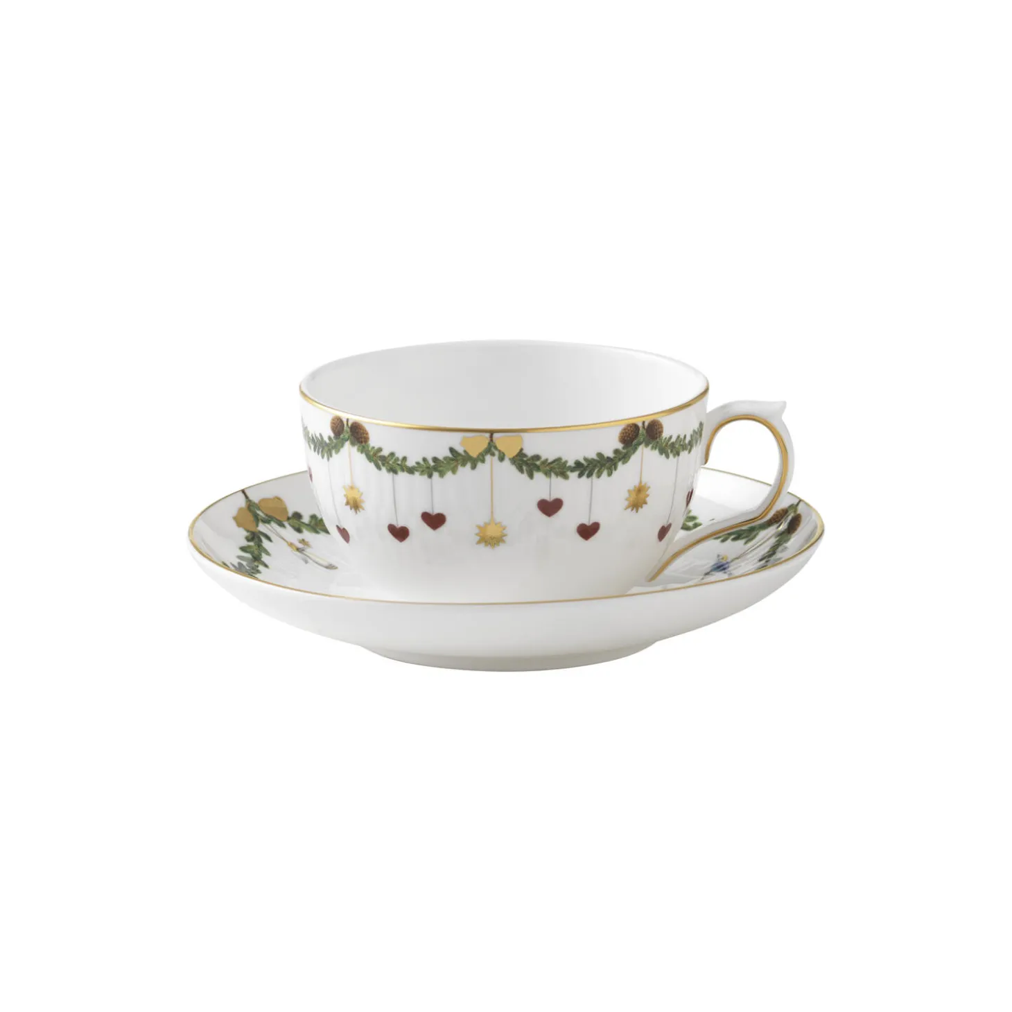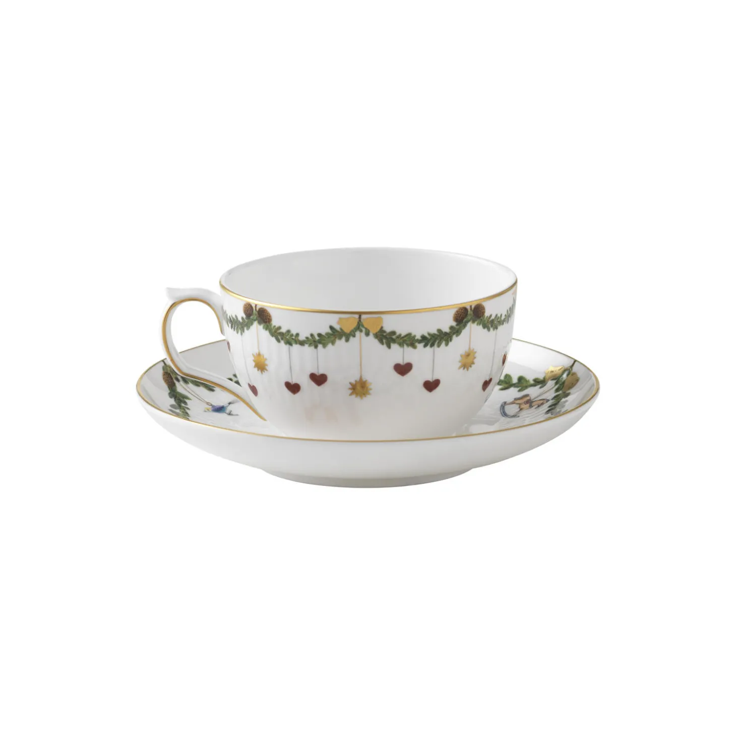 Stjerne Riflet Jul kop med underkop i benporcelæn fra Royal Copenhagen. Sæt stemningen til hyggelige juleaftener med denne Kop og underkop i det elskede julemønster fra Royal Copenhagen. Koppen er prydet med en ranke af gran, som snor sige hele vejen rundt om koppen. Fra grannet hænger der ornamenter af hjerter, kogler, stjerner og klokker. Koppen på 32 cl har en romantisk hank, som er dekoreret med gyldne linjer på begge sider. Denne guldkant finder du også på kanten af både koppen og underkoppen.