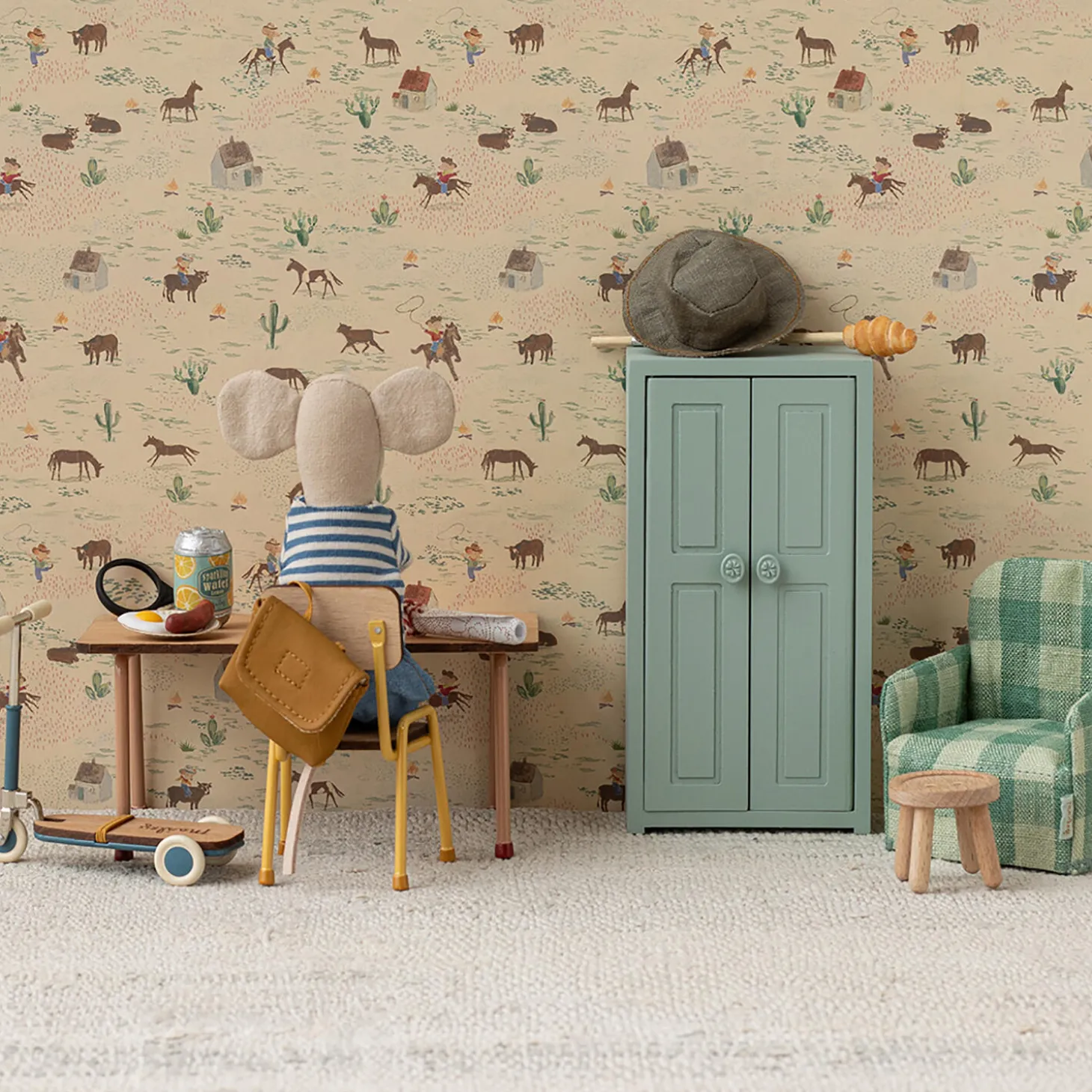 En stol der passer til musefamilien og kan bruges i mange situationer. Stolen er i samme model som sættet med bord og stole til mus. Bemærk de håndmalede detaljer på metallet.