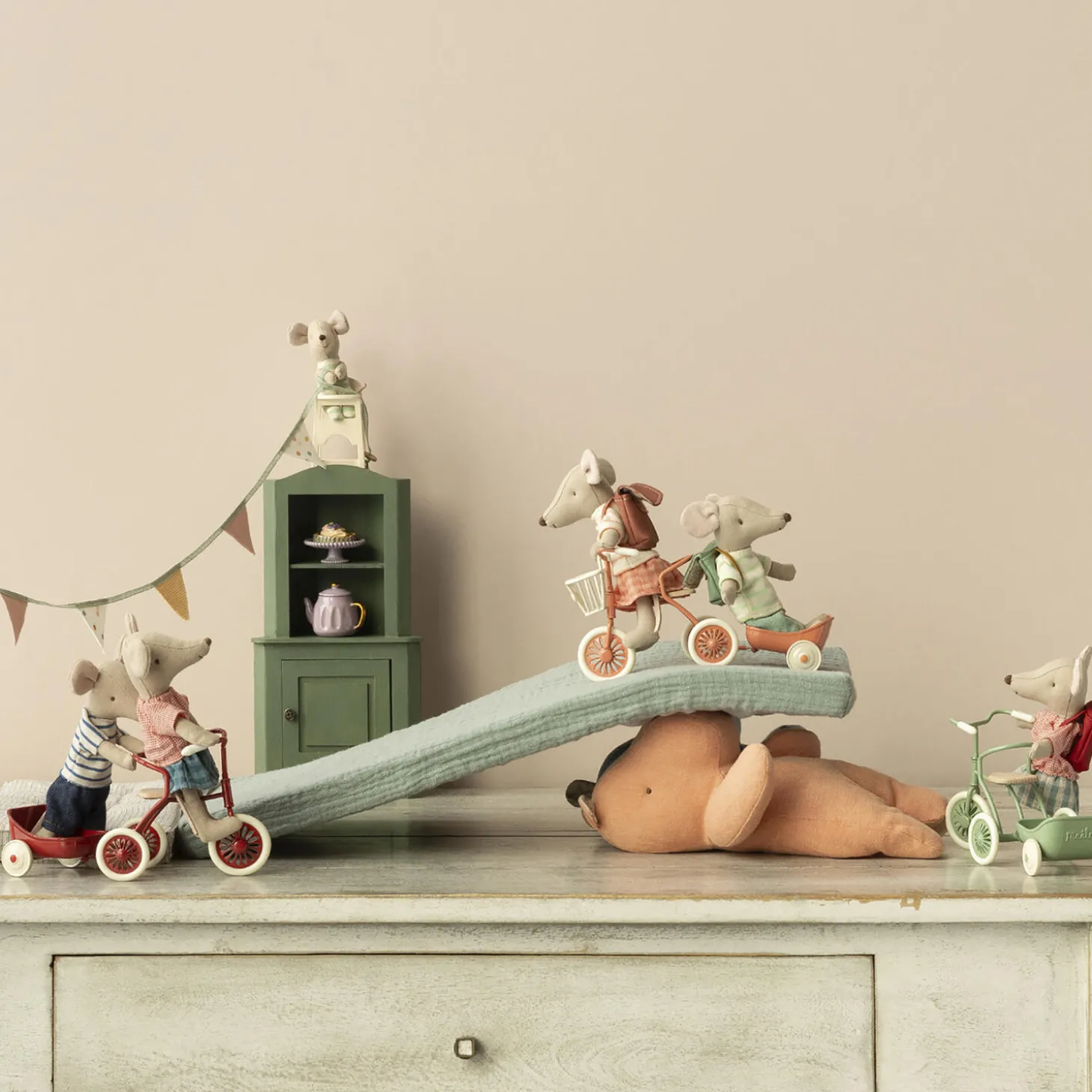 Storesøster mus er klar til en dag i børnehave eller skole, på ryggen bærer hun sin rygsæk. Hun har magneter i hænderne, så hun kan holde fast i håndtagene på den trehjulet cykel.
