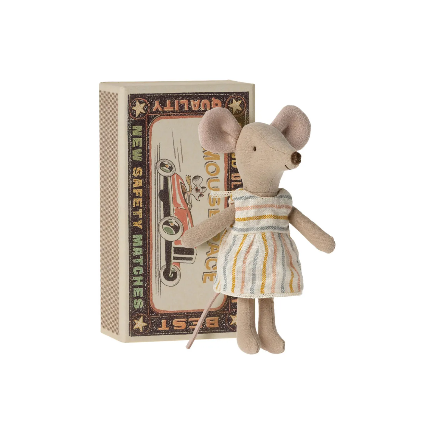 En klassisk Maileg vare. Denne mus er klar til timevis af leg og sover godt i en lille tændstikæske. Tøj og sengetøj er lavet af bløde stoffer med unikke mønstre og smukke farver.