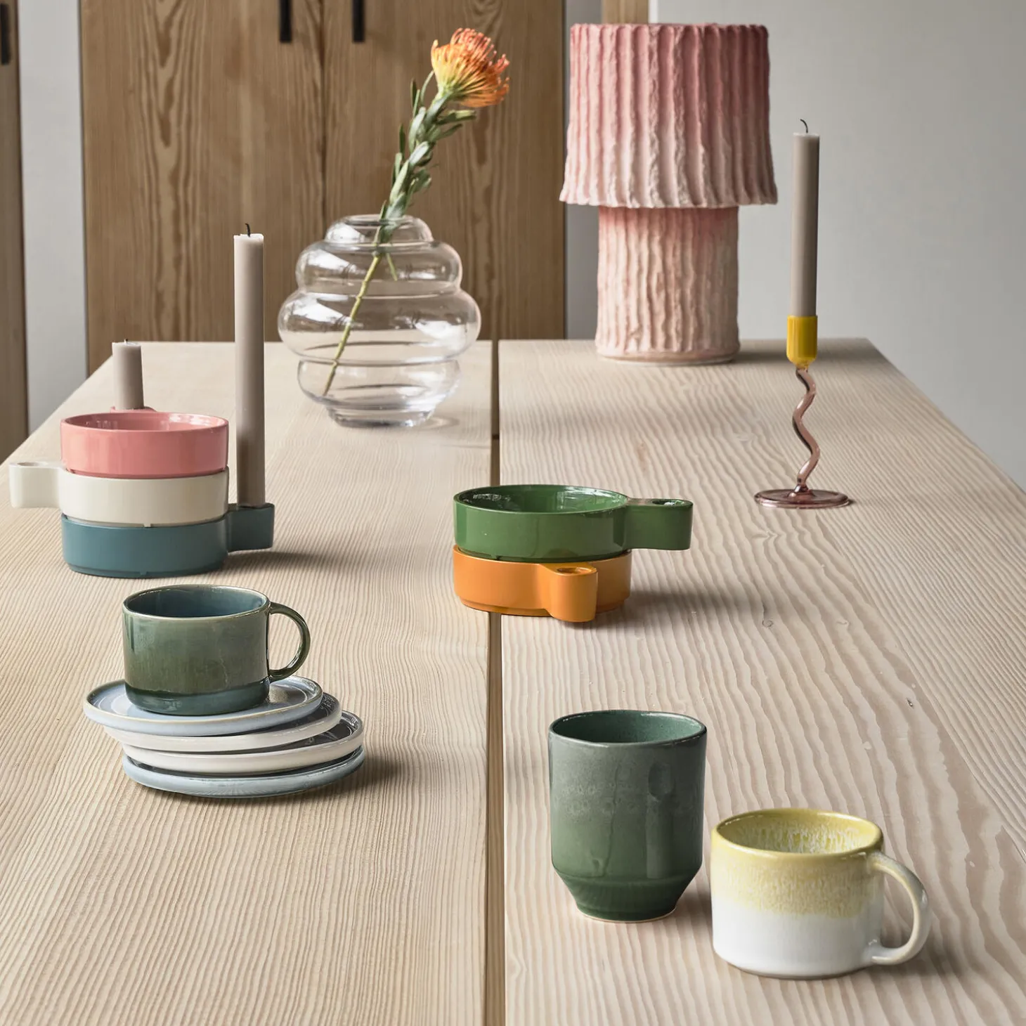2 espressokopper, 8 cl, i stentøj. Stentøjsstellet fra Villa Styles fremstilles i Portugal af keramikere med stor knowhow og erfaring. Alle steldelene formes og finpudses i hånden, hvilket giver et skønt og unikt stentøjsstel samt en glat og fin overflade. Herefter påføres den reaktive glasur, og stentøjet brændes i ovnen ved 1150 grader. Den reaktive glasur gør hvert produkt unikt. Udseendet afhænger af formen, brændetemperaturen og placeringen i ovnen. Alle glasurer er skabt fra bunden af vores portugisiske producent. De nøje udvalgte glasurer i livsbekræftende og eksklusive farver tiltaler øjet. Serien kan sættes sammen på kryds og tværs, og derved skabes et personligt stel. Den brede vifte af farver indeholder noget for enhver smag, både den farveglade og den mere afdæmpede. Fabrikken genanvender vandet, der bruges i produktionen, og varmen genereret af keramikovnene bliver ført ind i rummene, hvor keramikken tørres, så al gasenergi genanvendes. Fabrikken laver sit eget ler og genanvender alle rester ved at blande dem med nyt ler og bruge blandingen til nye produkter, så der ikke er noget, der går til spilde.
