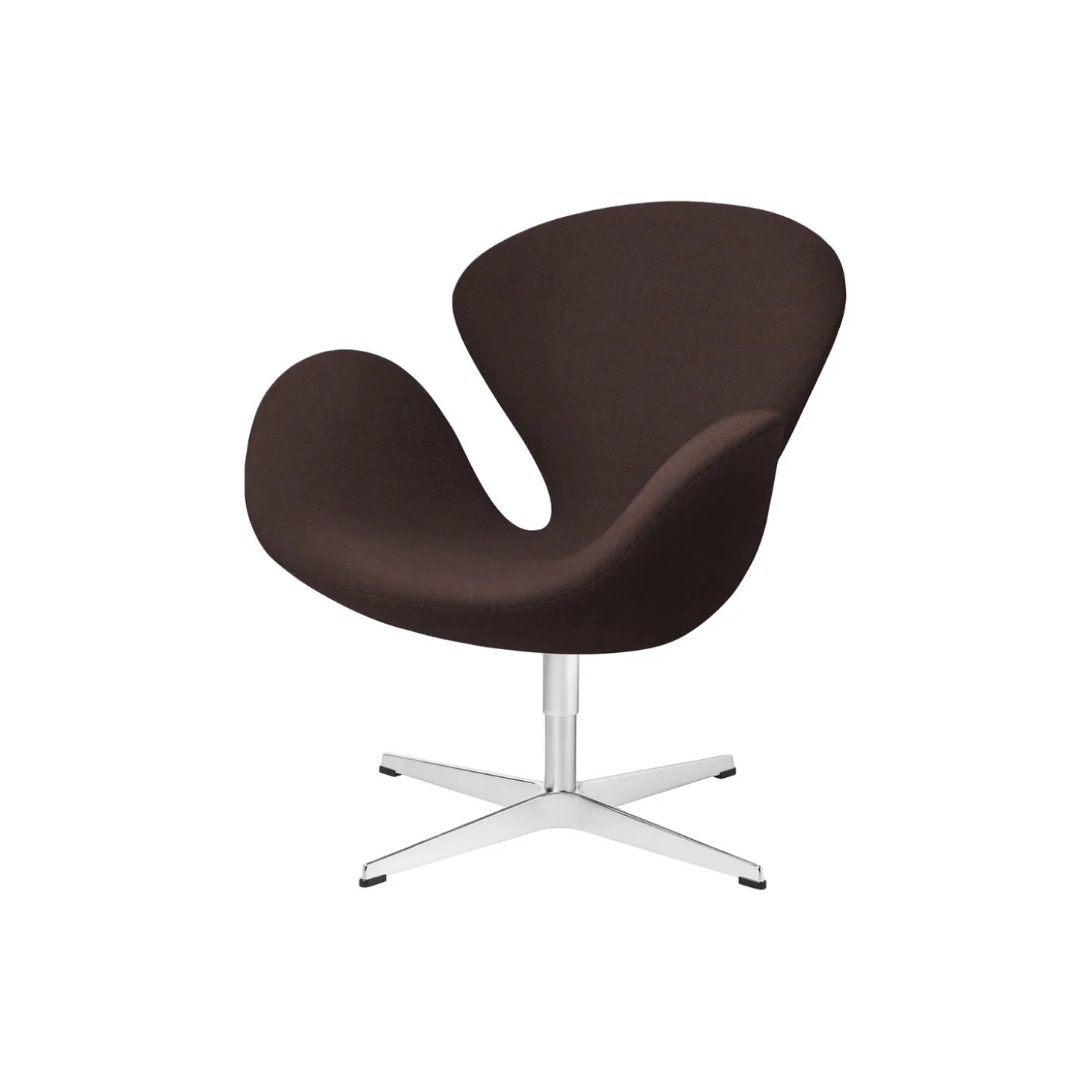 Svanen™ 3320 loungestol med polstring i Christianshavn 1135 og stel i satinpoleret aluminium fra Fritz Hansen. Farve: orange/blå. Mål: H: 77 x B: 74 x D: 68 cm. Siddehøjde: 40 cm. Design: Arne Jacobsen.