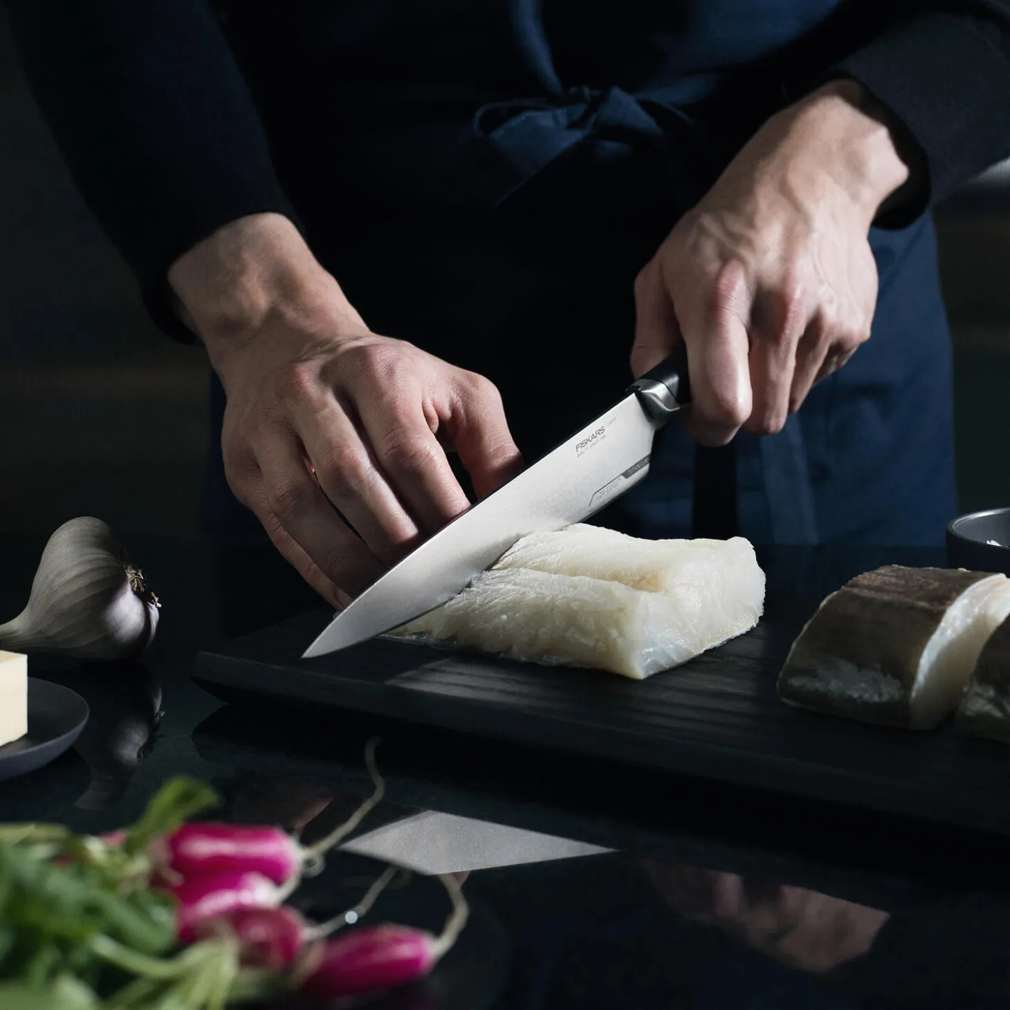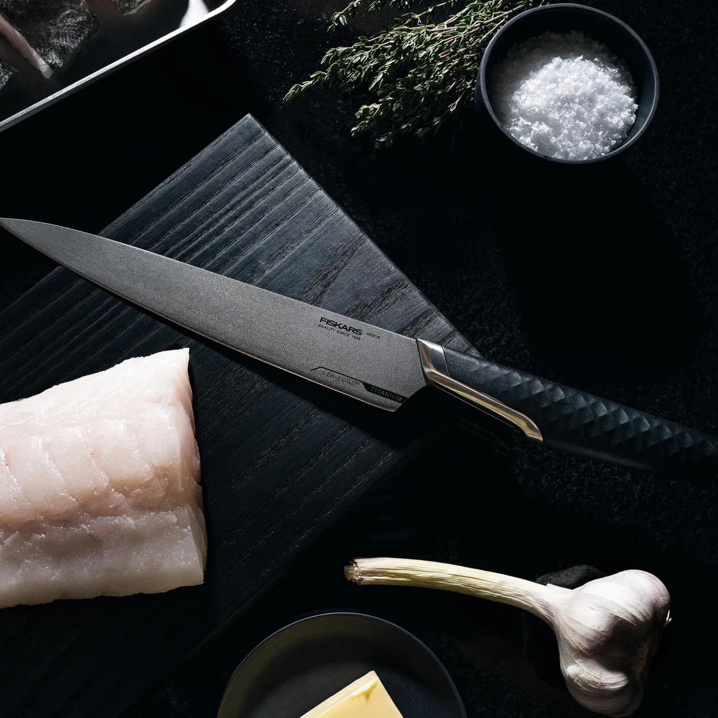 Fiskars Taiten er innovative køkkenknive, der slipper fantasien løs og giver fuld kontrol, når du frembringer lækre, kreative retter. Takket være sit titaniumblad er Taiten forskærerkniv på 21 cm ekstraordinær let med en vægt på blot 101 g. Det gør kniven nem at bruge, og udskæringen af dine råvarer bliver hurtigere og mere præcis. Den revolutionerende LZR-EDGE™-teknologi, hvor partikler af titaniumkarbid bliver påført æggen med laser, holder kniven skarp op til fire gange længere end standardknive. Titanium giver også ultimativ beskyttelse mod rust og forlænger levetiden. Det ergonomisk-designede håndtag med tredimensionelt mønster sørger for et behageligt greb. Knivbryst og endekapsel i rustfrit stål giver perfekt balance, mens det lange, lige og knivskarpe blad er fremragende til udskæring af stege. Vær opmærksom på, at titanium ikke er et magnetisk materiale, så kniven kan ikke opbevares på magnetiske knivholdere som f.eks. en magnetisk knivskinne eller knivblok. På grund af det særlige titaniumblad anbefaler vi kun slibning med slibesten og opvask i hånden, når kniven skal rengøres. Skær aldrig i frosne madvarer eller andre ekstremt hårde ting. 25 års garanti. Designet i Finland.