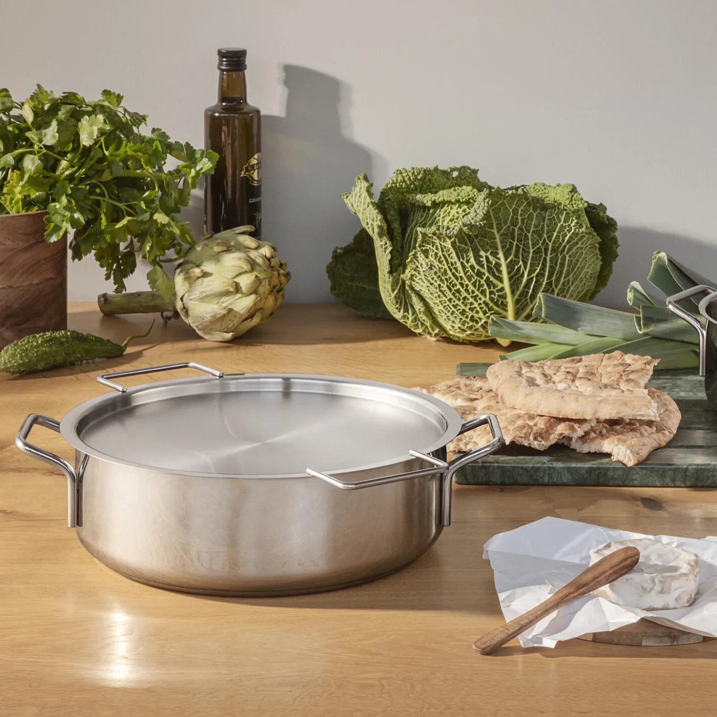 Tallerkenlåget kombinerer klassisk enkelhed med praktisk funktionalitet. Med dets lange håndtag kan du løfte låget og kigge til maden uden at skolde hænderne på opstigende damp. Låget kan stables eller hænges på en krog. Det flade design gør det muligt at placere tallerkener eller skåle på låget for at holde dem varme, mens du laver mad. Hoveddelen af låget er fremstillet af 90 procent genanvendt post-consumer stål. Alle gryder, pander og låg fra Eva Trio har faste størrelser, der kan stables og kombineres på tværs af modeller og materialer. Denne smarte løsning giver dig friheden til at vælge præcis det låg, du har brug for, samtidig med at det reducerer antallet af nødvendige låg. Eva Trio låg kan købes enkeltvis og tåler både ovn og opvaskemaskine.