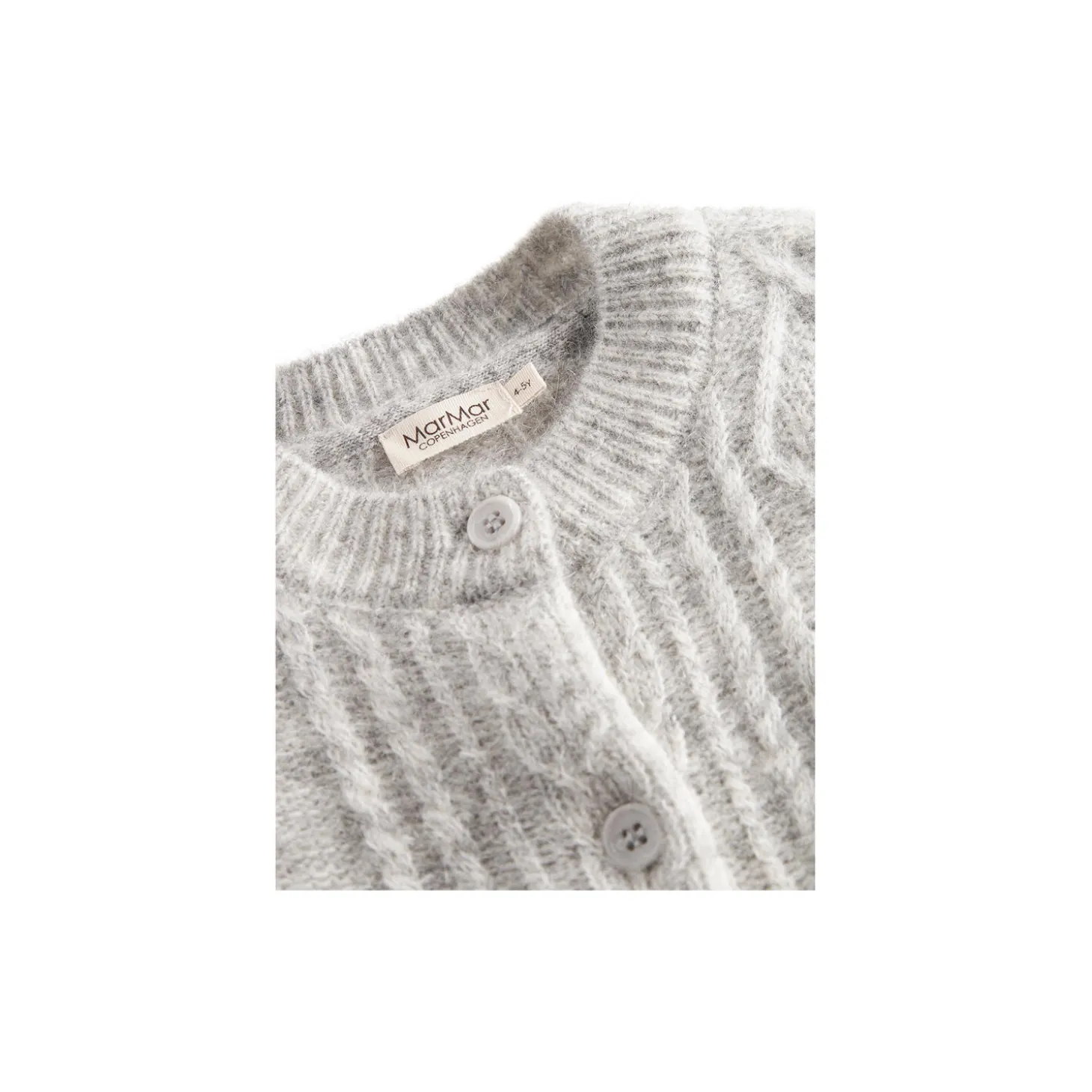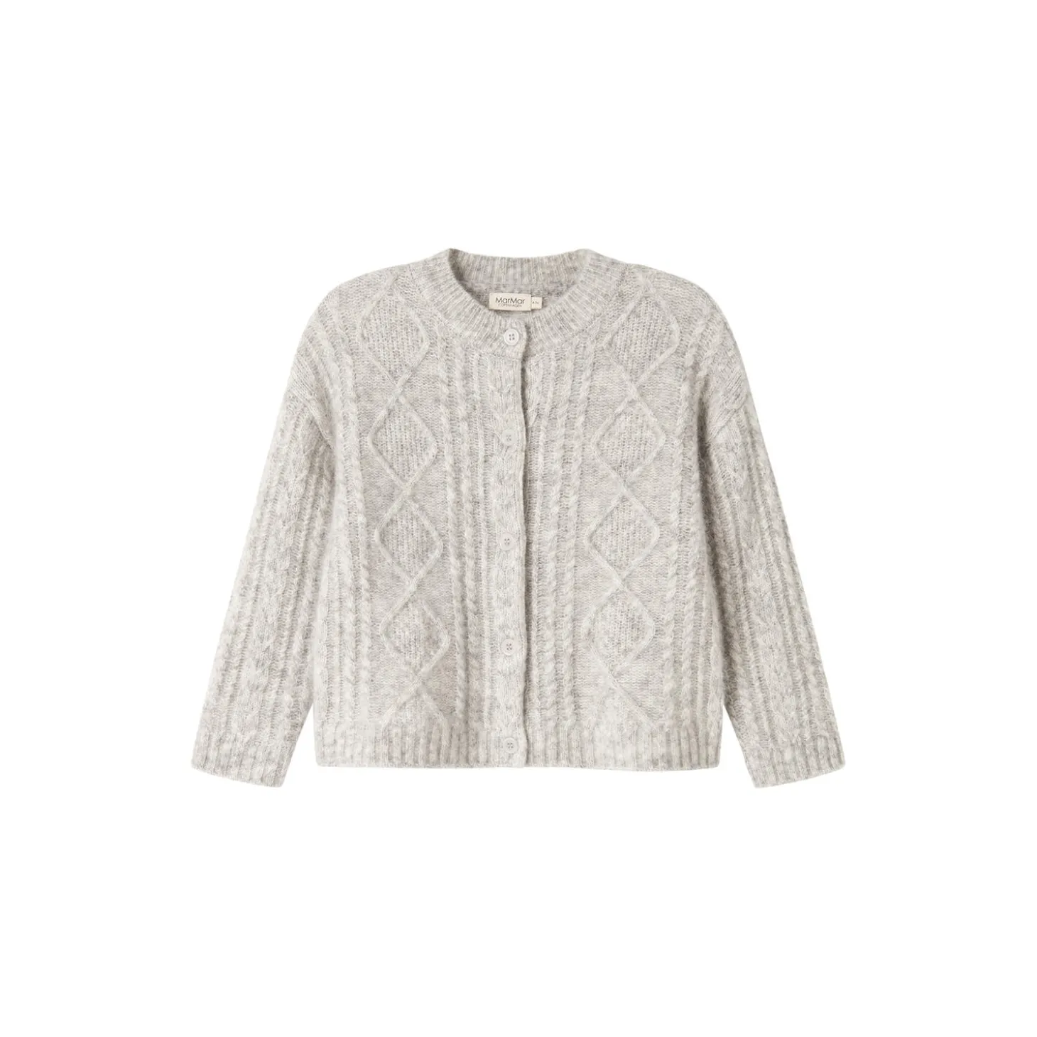 Varm og behagelig mohair strik cardigan med kabelstrik detaljer og knaplukning foran.