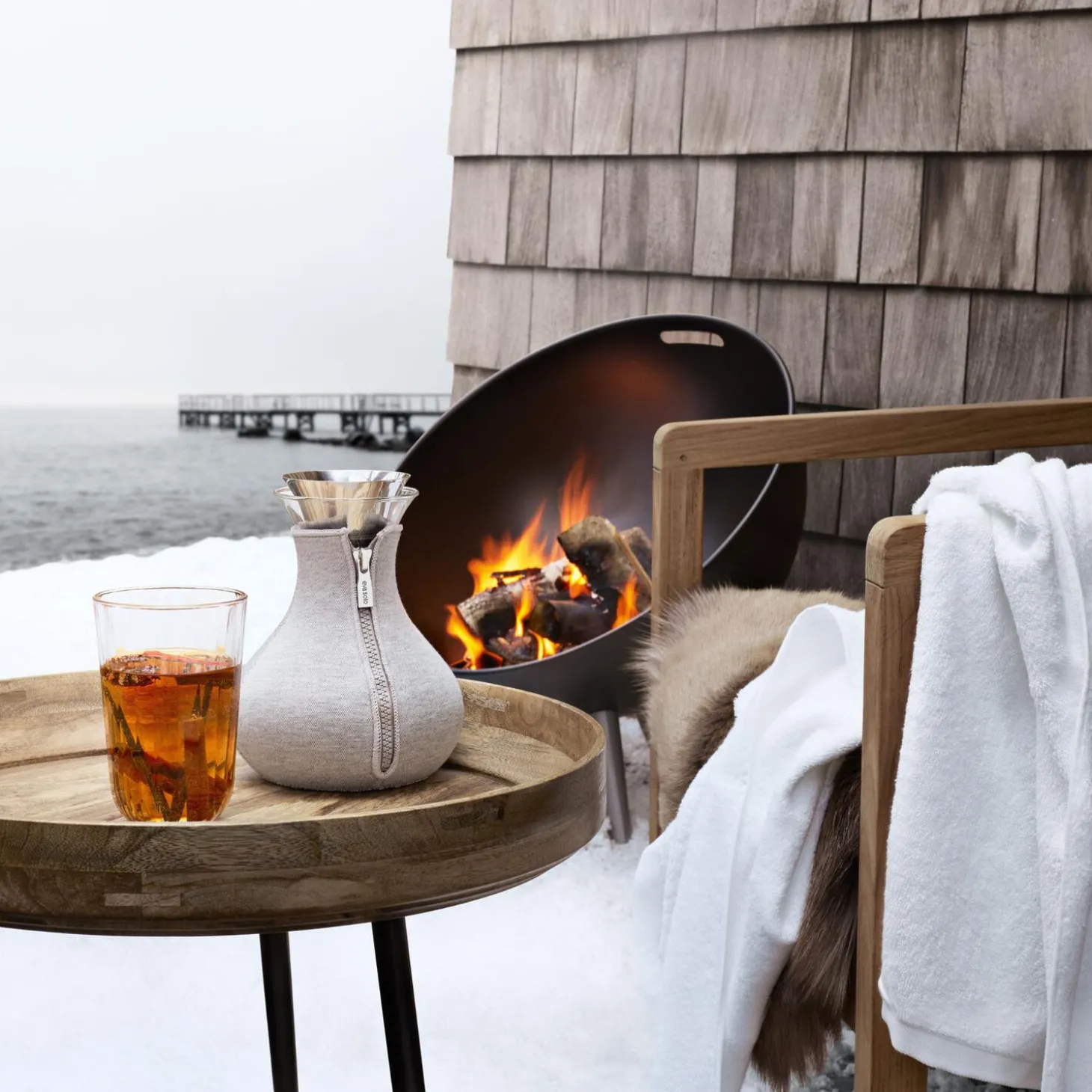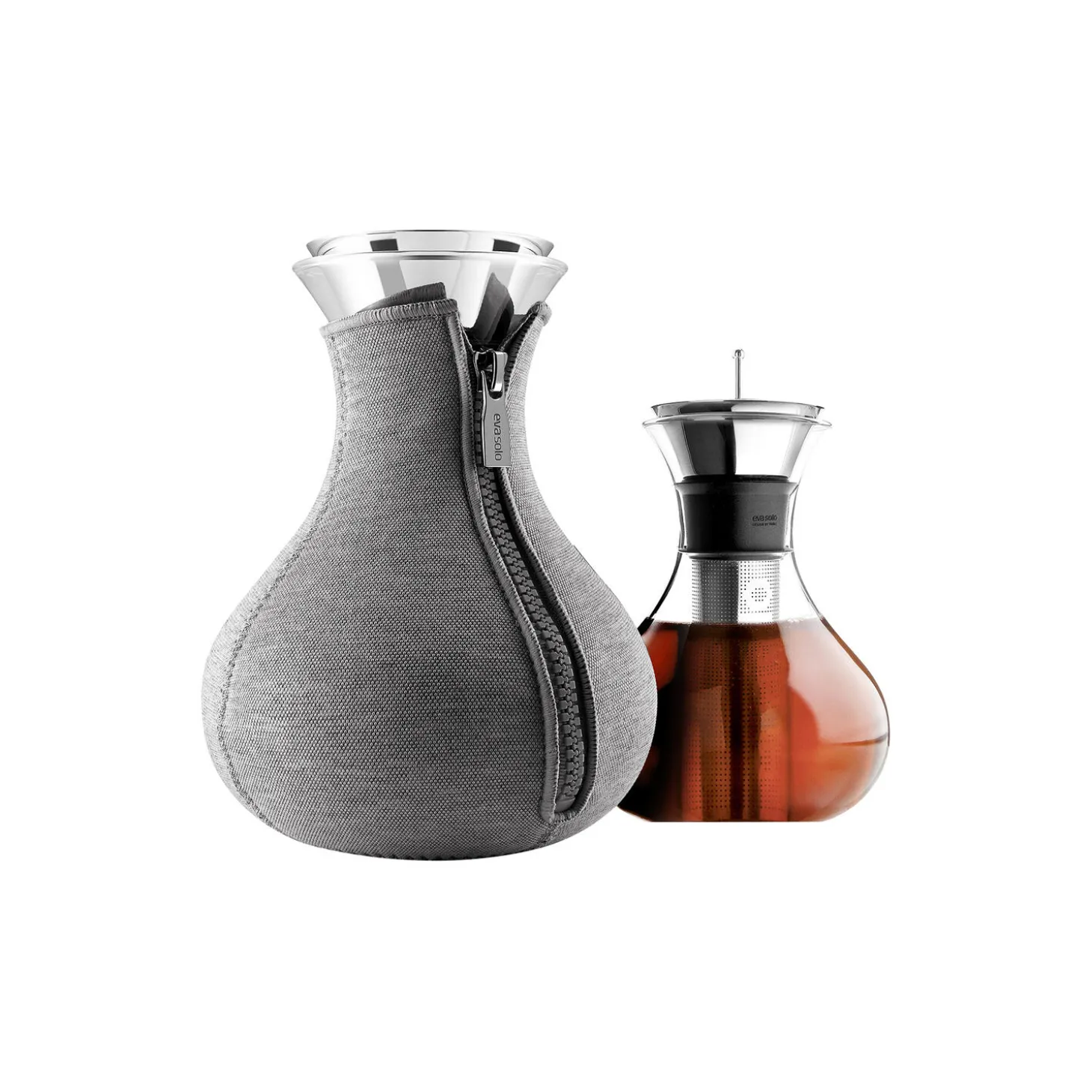 Teblade uden garvesyre, der kan trække i ubegrænset tid, kan fyldes direkte i glaskanden. Sæt filteret i og bladene bliver i kanden, når du hælder. Skal teen kun trække i begrænset tid, fyldes tebladene i stedet ned i filteret. Tryk stemplet i bund, når trækketiden er forbi og skænk op – du behøver hverken fjerne teblade eller filter. Tebryggeren er drypfri og har et vippelåg, der automatisk åbner, når du skænker. Neoprendragt holder teen dejlig varm.