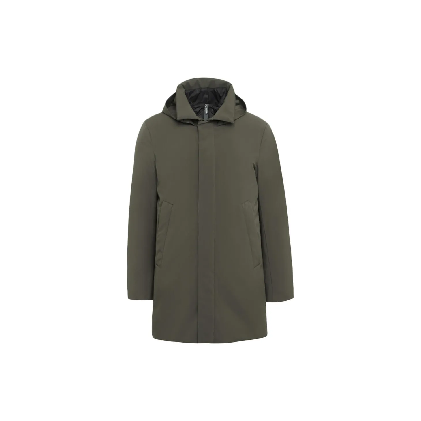 Frakke med aftagelig hætte med snor. Lynlåslukning foran og store sidelommer. Indvendige lommer med lynlås og quiltet for indvendigt med polstring