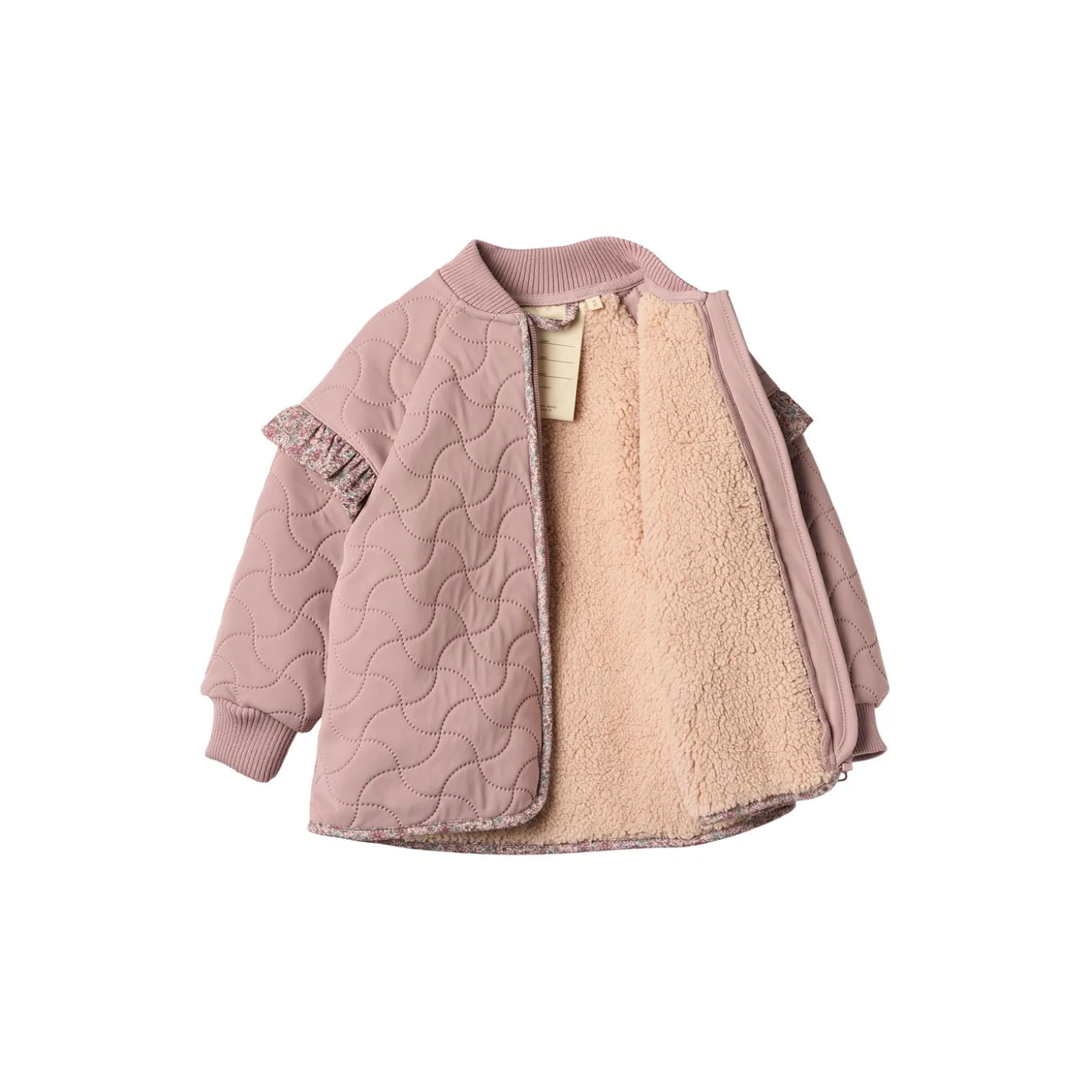 New piled Thermo jacket with ruffle details for babies. – Rib collar- Open welted pocket at the side seam- Ruffles on the shoulders- Dropped shoulders- Zipper with chin guard- Rib cuffs- Reflectors- Wheat signatur details – Pile liningWheat’s popular thermo wear for babies is a true everyday favourite, as the soft and lightweight material makes it comfortable to move and play in. The thermo jacket is produced in 100% recycled polyester and can be used as a cozy layer indoor and as practical transitional outerwear. It is not waterproof but is water repellent and is suitable for damp weather.It is great for in between seasons, when your child needs some lighter outerwear or as an extra layer underneath rainwear or technical outerwear on colder days. —Technical details:- 3-layer material for the ultimate isolation- Water repellent (not waterproof)- Florine-free (BIONIC-FINISH® ECO)- PFC-free- The product is GRS certified— – Standard 100 by OEKO-TEX®- 100% Recycled polyester- Pile lining: 100% Recycled polyester
