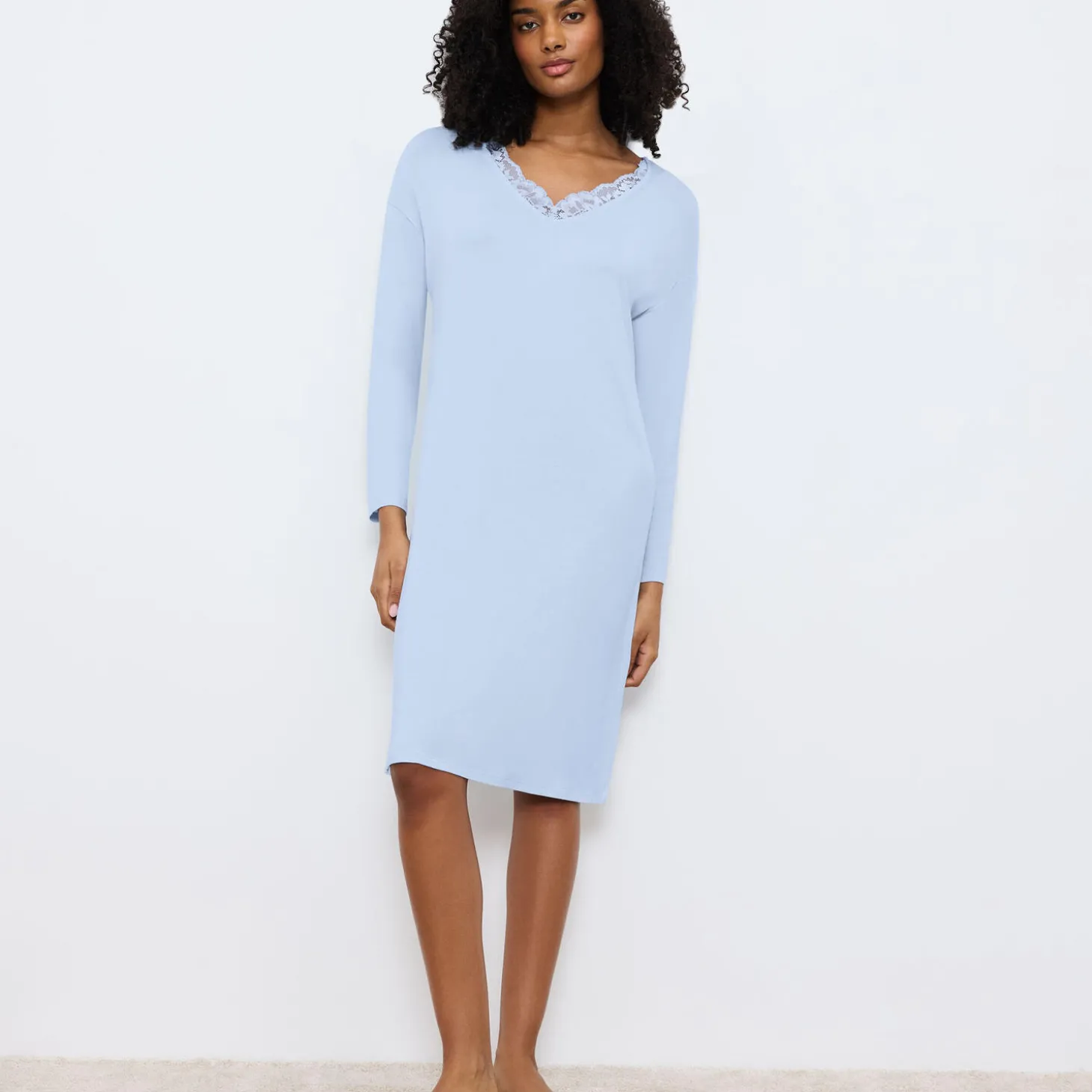 Natkjole fremstillet af 94% certificeret TENCEL ™ Modal. Med lange ærmer og knælængde, er den ideel til køligere nætter. Det bløde, elastiske materiale falder smukt og er let at vedligeholde. Dekorative blondeindsatse giver den perfekte balance mellem komfort og elegance.