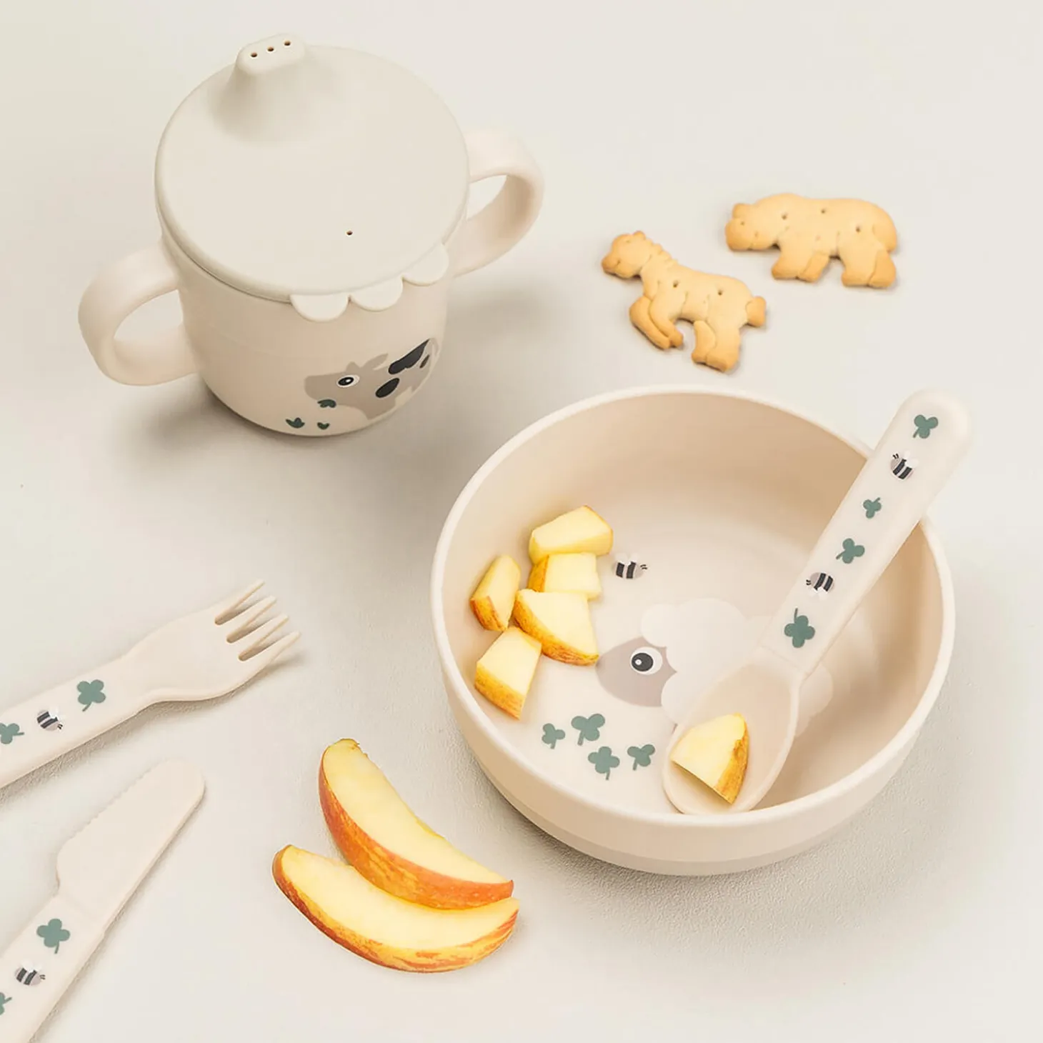 • En praktisk antiskrid-base sikrer, at skålen bliver på sin plads under måltidet• Høj kant hjælper dit barn med at få maden op• Fremstillet af fødevaregodkendt PP, fri for BPA og andre skadelige stoffer• Kan bruges i mikrobølgeovn og vaskes i opvaskemaskine• Materialet er stærkt, langtidsholdbart og genanvendeligt• Fin sandfarve med et underholdende motiv af Sheepy• Lad en Deer friend inspirere dit barn til at udforske madens verden