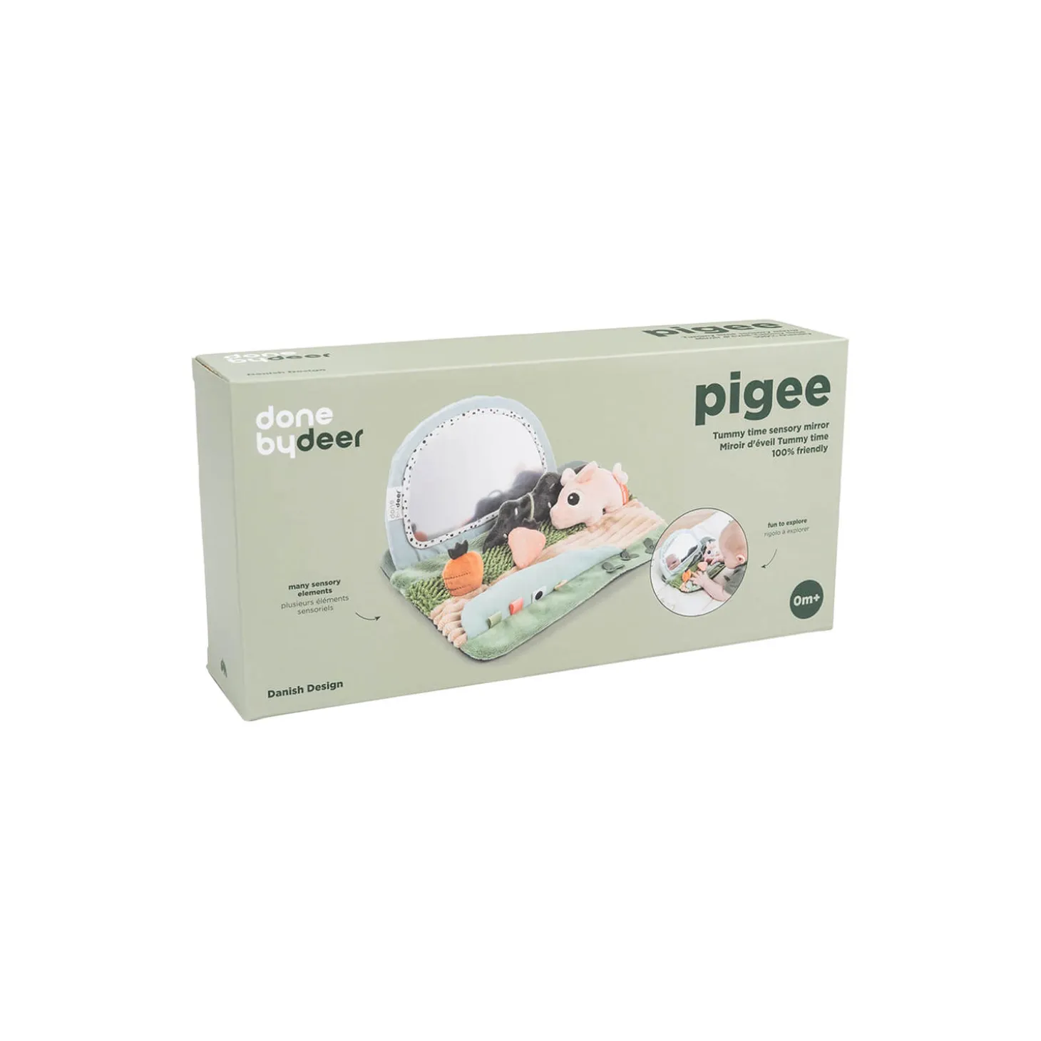 • Sensoriske elementer som en rangle, en klokke, knitren og mange forskellige teksturer vil stimulere dit barns hørelse og taktile sans• Juster spejlets vinkel, så det passer til dit barns udviklingstrin• Spejlet er blødt og sikkert for babyer at lege med• Praktisk antiskrid-underlag holder legetøjet på plads under leg• Sjove kontraster og farverige elementer for visuel stimulering• Lad din baby øve mavetid med Pigee