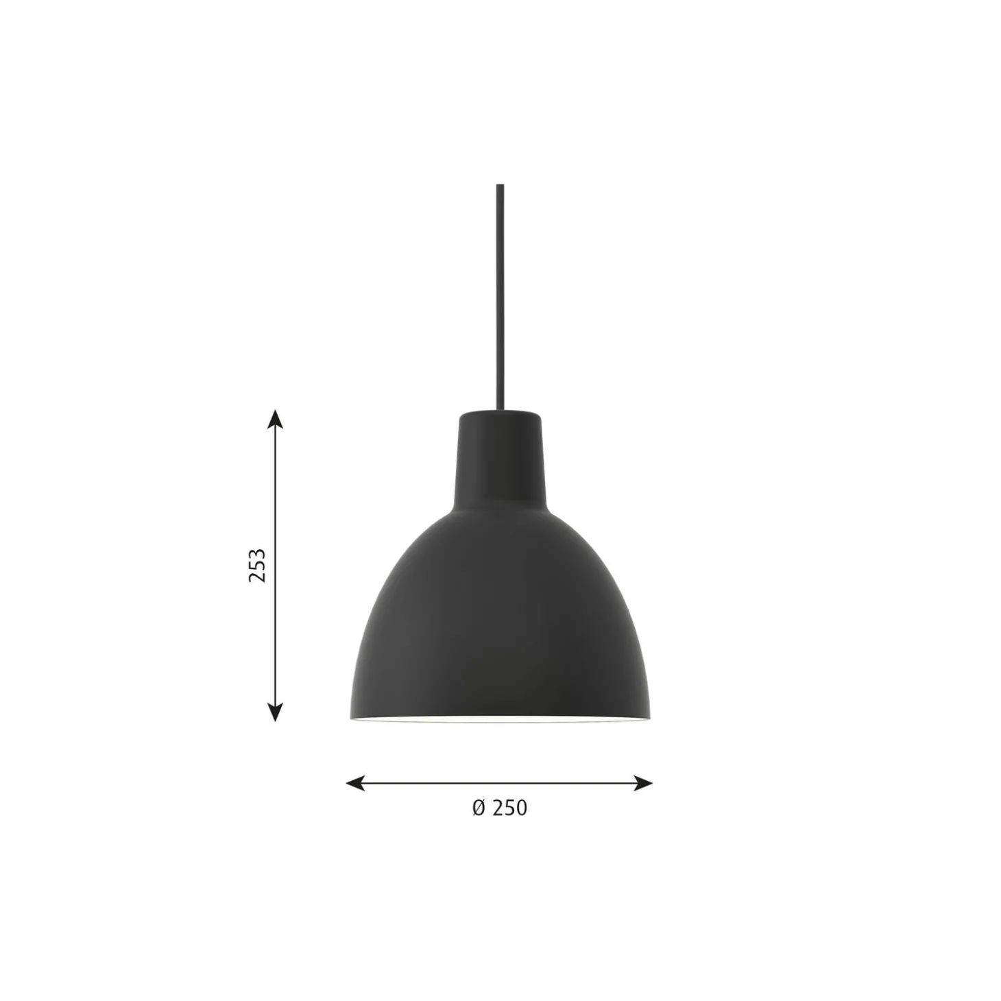 Toldbod 250 pendel i optrukket aluminium fra Louis Poulsen. Farve: sort. Mål: H: 25,3 x Ø 25 cm. Lyskilde: maks. 60W E27. Design: Louis Poulsen.