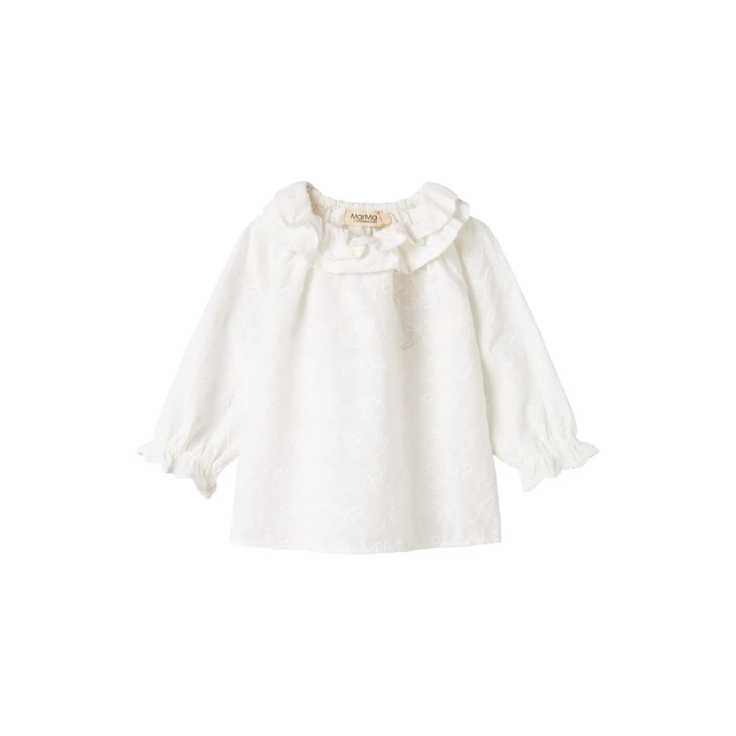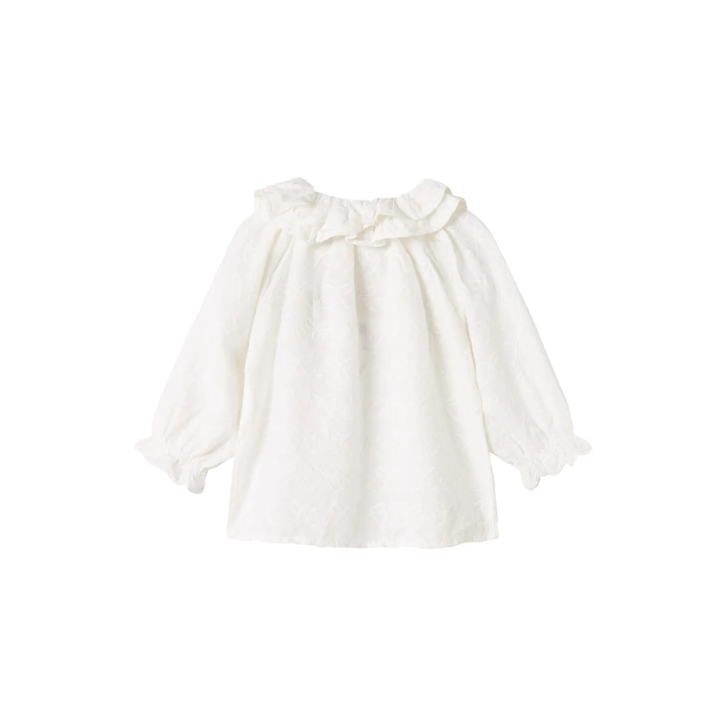 Løstsiddende og langærmet bluse med broderede sløjfer og flæsedetaljer.