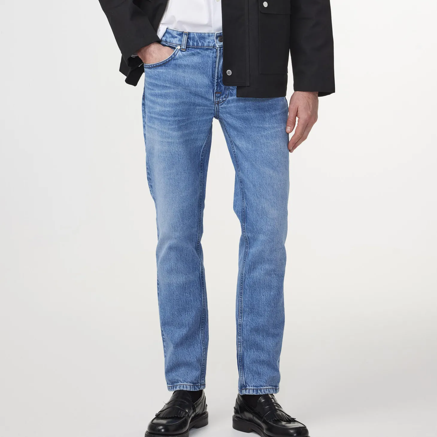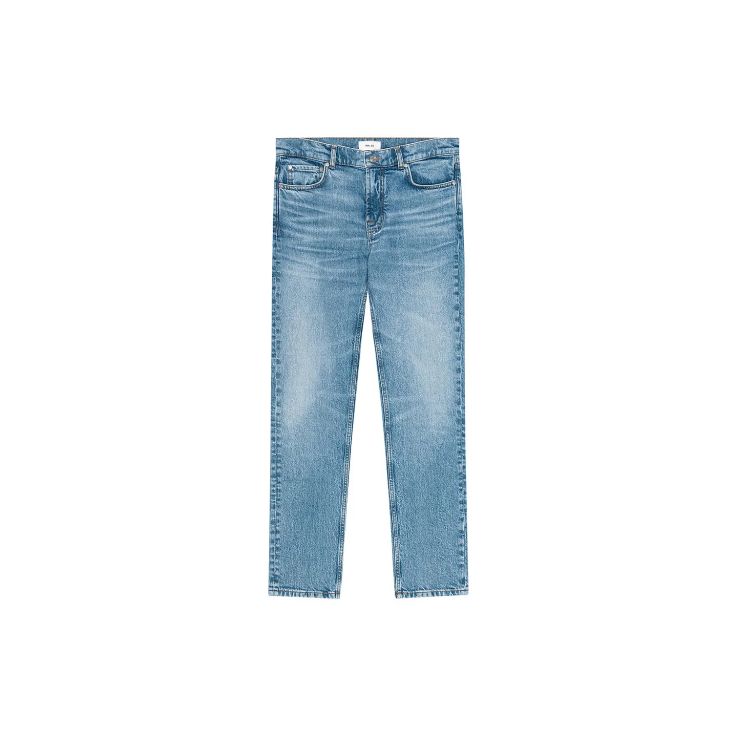 Tætsiddende jeans med fem lommer fremstillet af 12,75 oz økologisk bomuldsdenim med en smule stretch. Lavet med whiskering-detaljer og afsluttet med et blåt broderi langs baglommen.