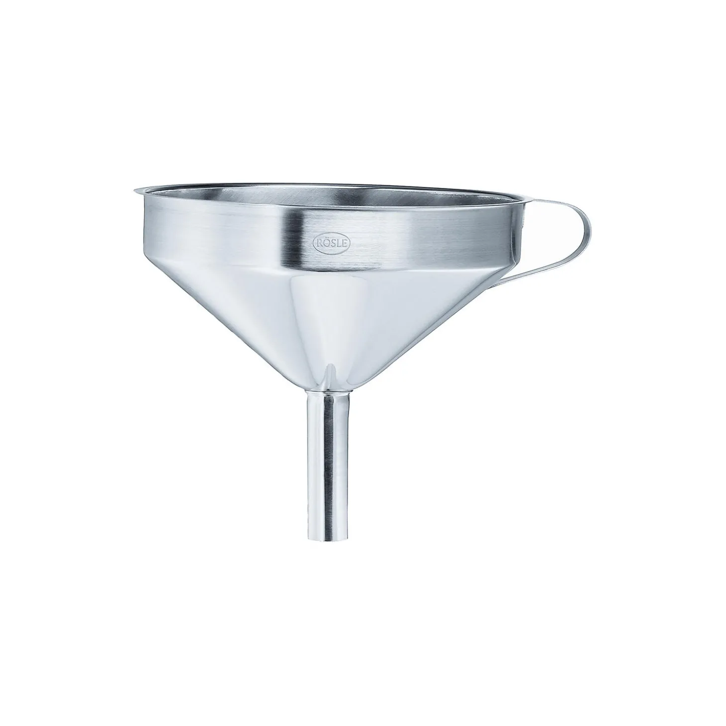 RÖSLE tragt med udtagelig si fremstillet i stærkt 18/10 rustfrit stål. Tåler opvaskemaskine. Mål: Ø: 12 cm.