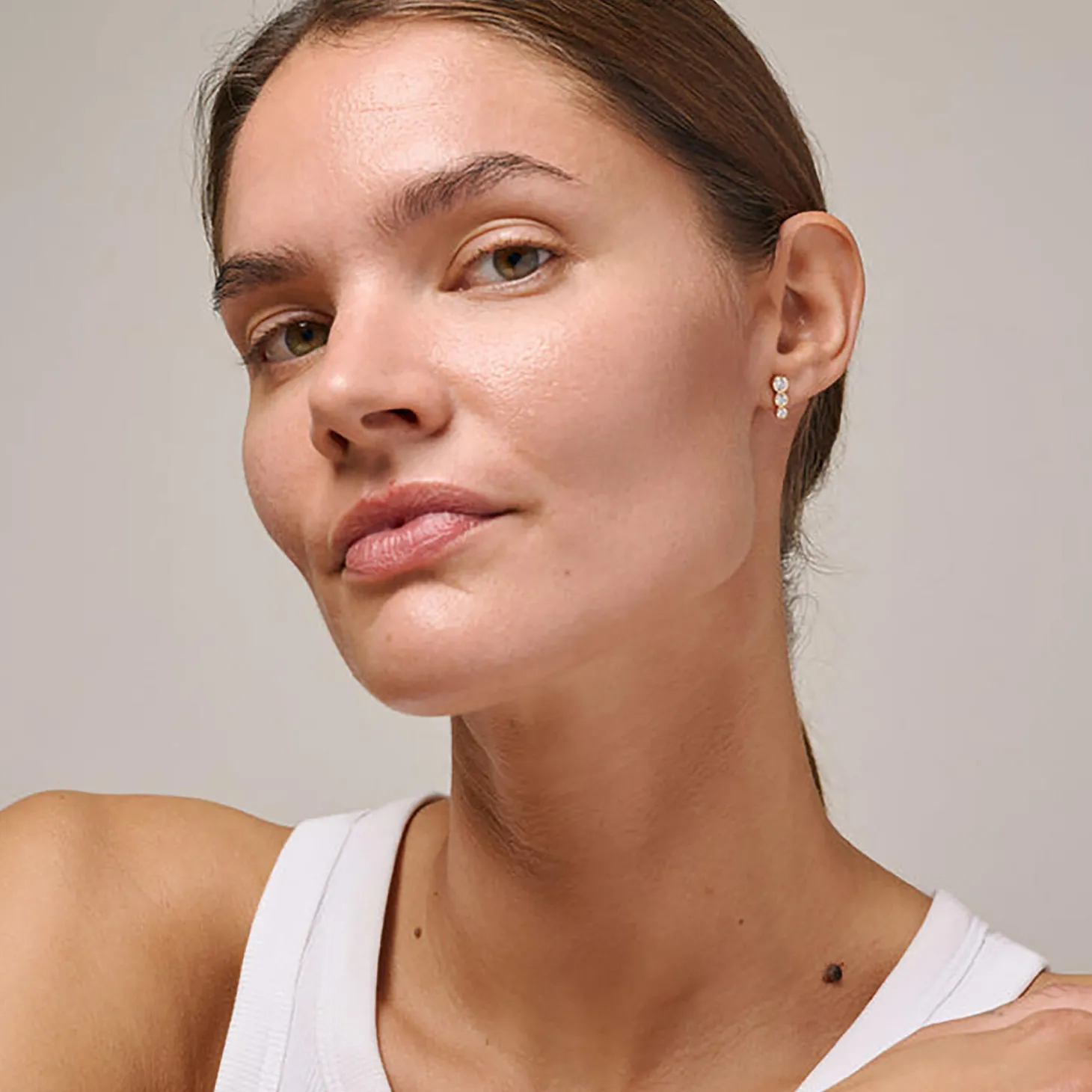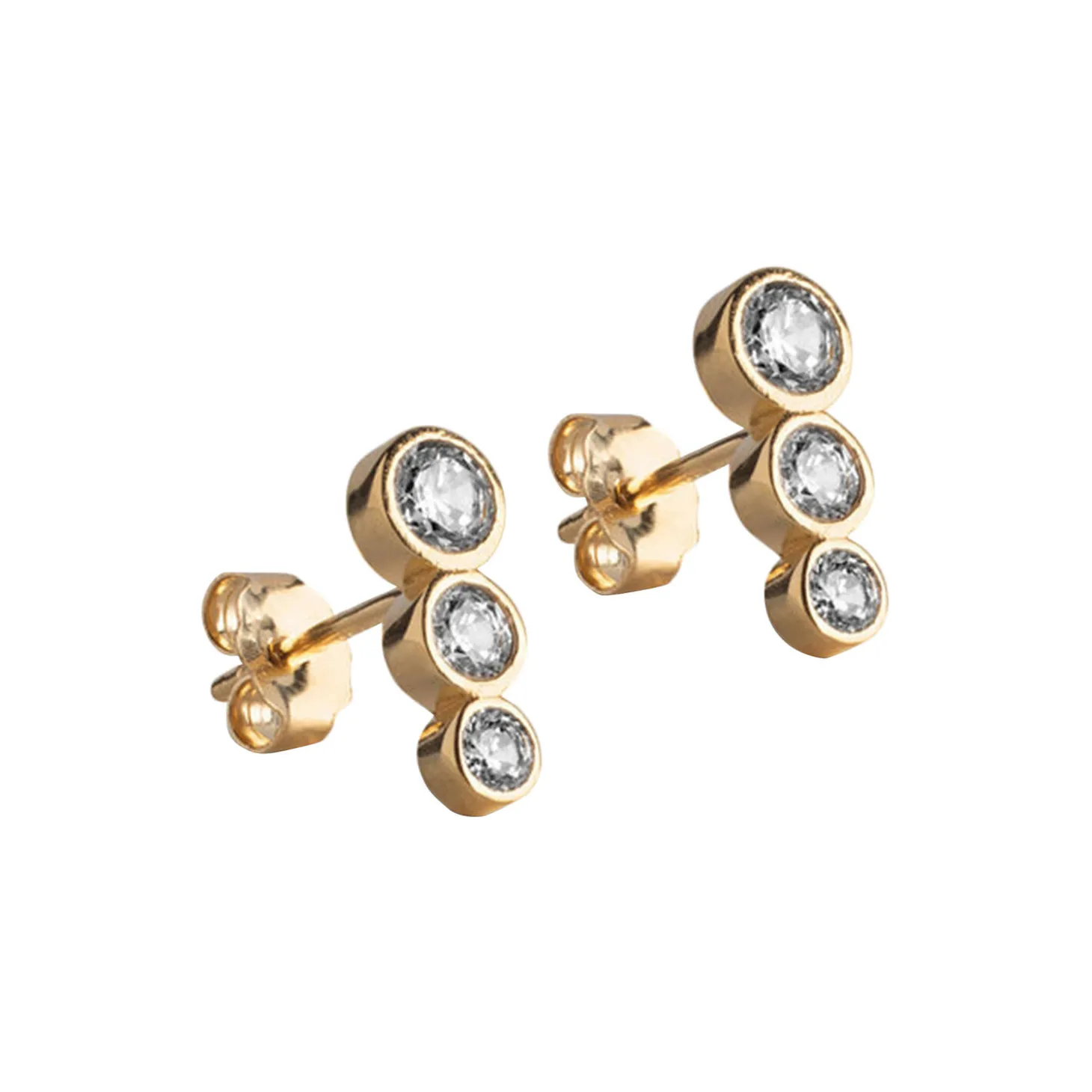Trinity CZ ørestikker fra ENAMEL Copenhagen er et par elegante guldøreringe, som er perfekte til et diskret og smagfuldt festoutfit. Tre rørfatninger i forskellige størrelser med hver deres funklende zirkonia skaber dette elegante design. Hvis du er på udkig efter et par små øreringe, der kan bruges til både hverdag og fest, er Trinity CZ-ørestikker det perfekte valg. Trinity-ørestikkerne kan også nemt styles med andre markante øreringe.