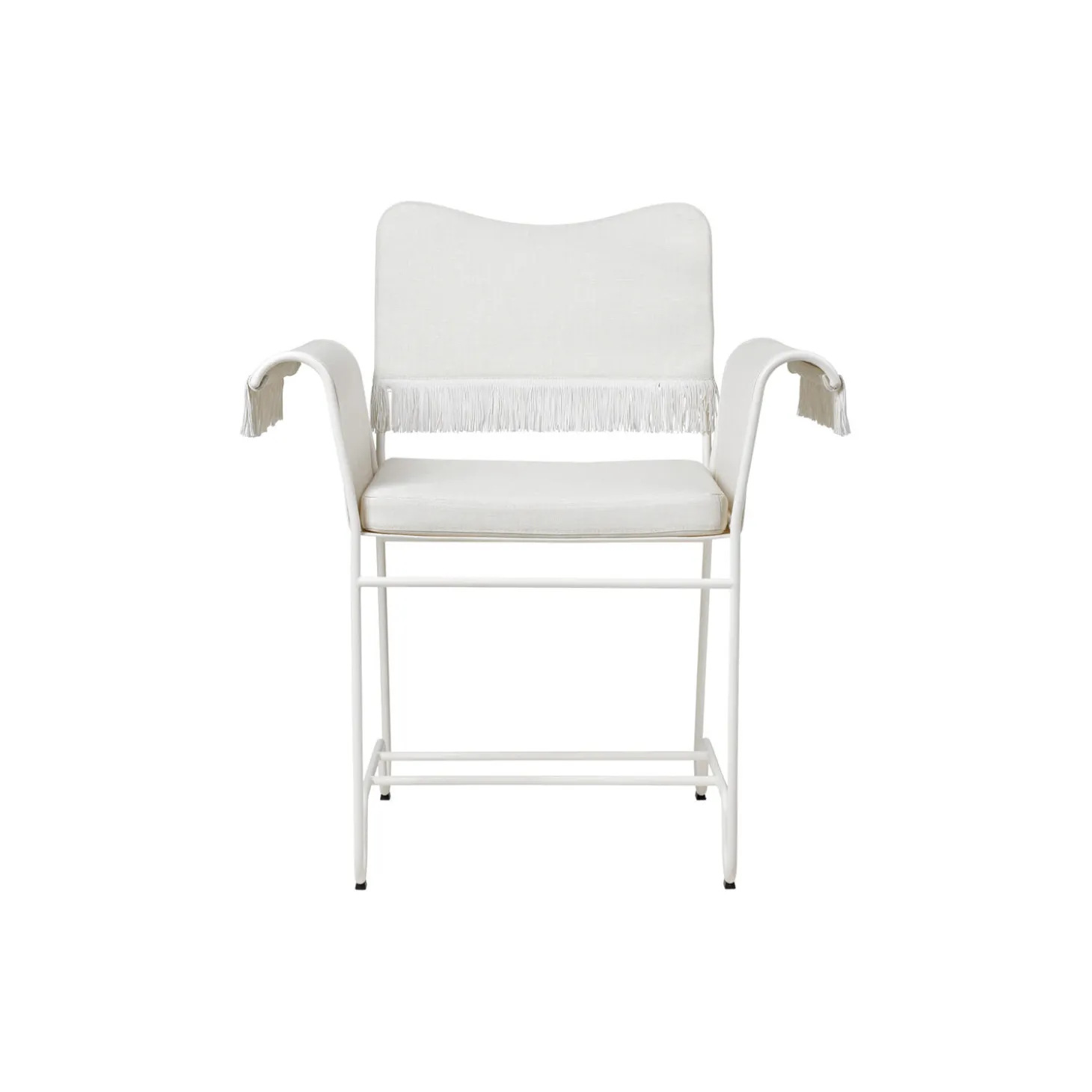Tropique Dining Chair with Fringes i Leslie Limonta 06 tekstil, frynser og stel i lakeret rustfrit stål fra GUBI. Farve: Leslie Limonta 06/classic white semi matt. Mål: H: 86 x B: 71 x D: 58 cm. Siddehøjde: 45 cm. Design: Mathieu Matégot.