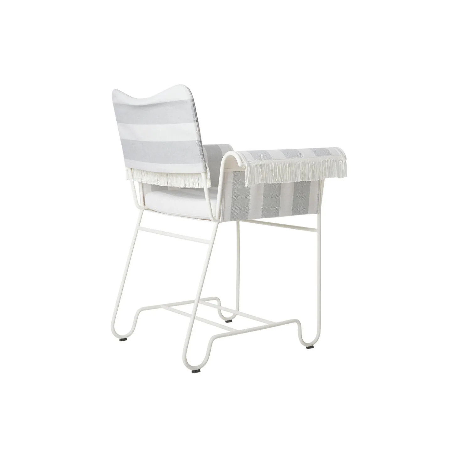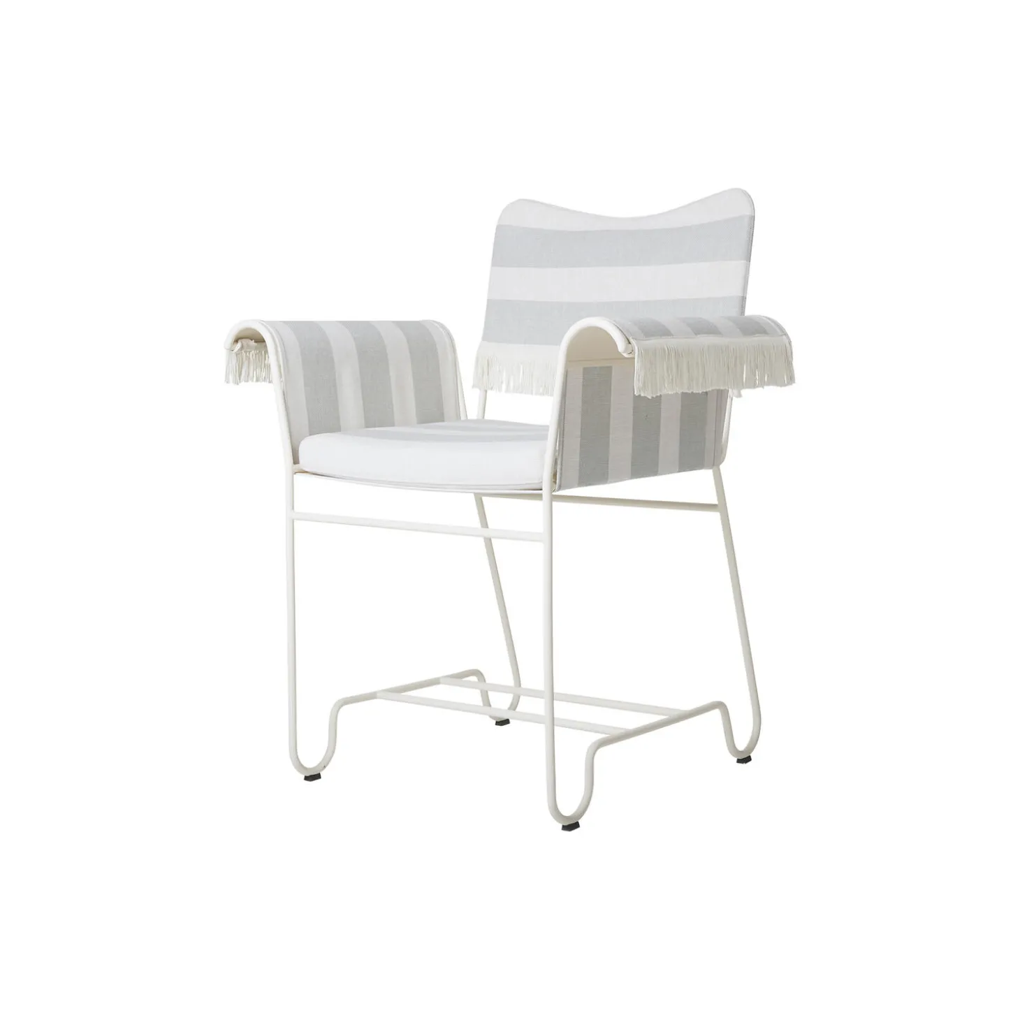 Tropique Dining Chair with Fringes i Leslie Stripe Limonta 20 tekstil, frynser og stel i lakeret rustfrit stål fra GUBI. Farve: Leslie Stripe Limonta 20/classic white semi matt. Mål: H: 86 x B: 71 x D: 58 cm. Siddehøjde: 45 cm. Design: Mathieu Matégot.