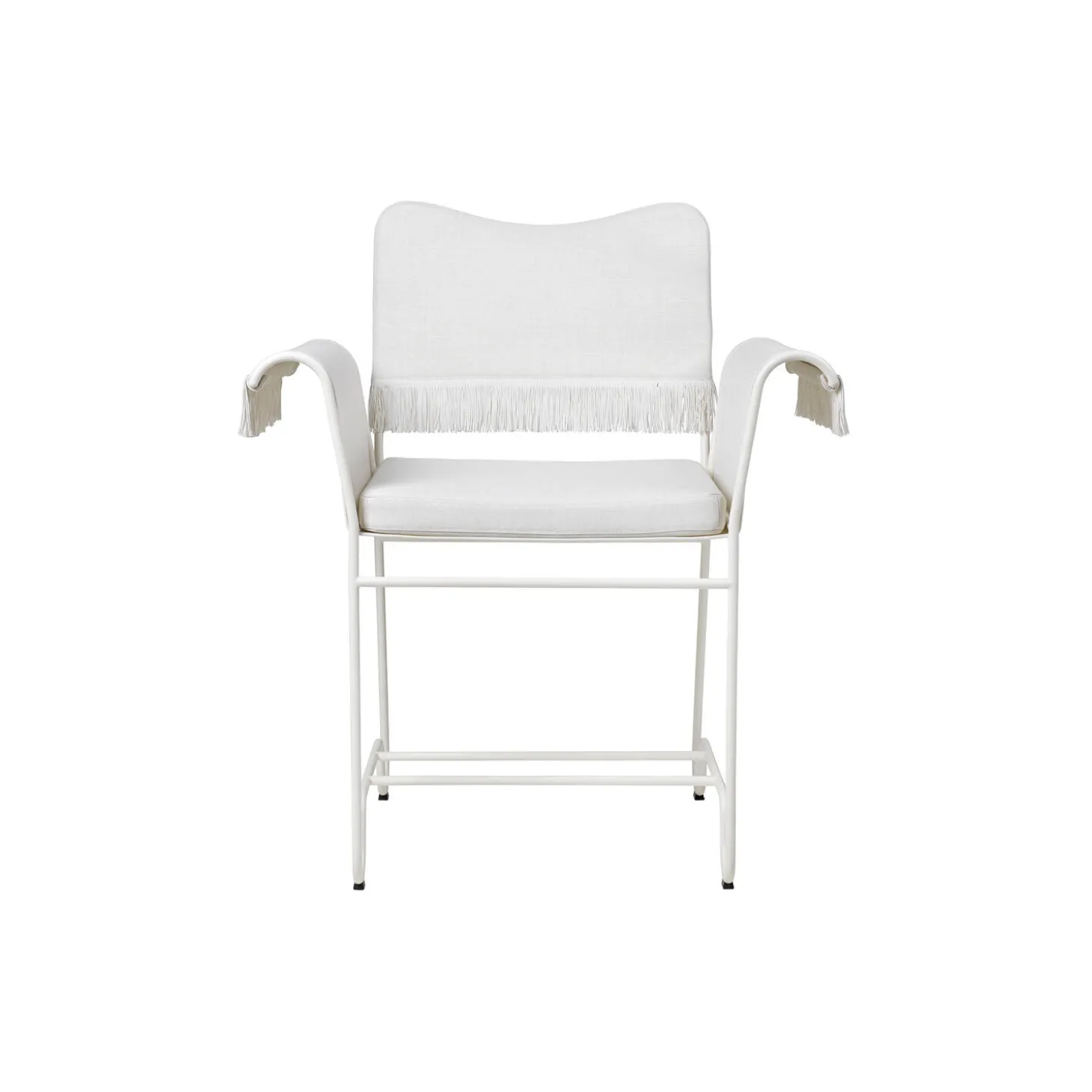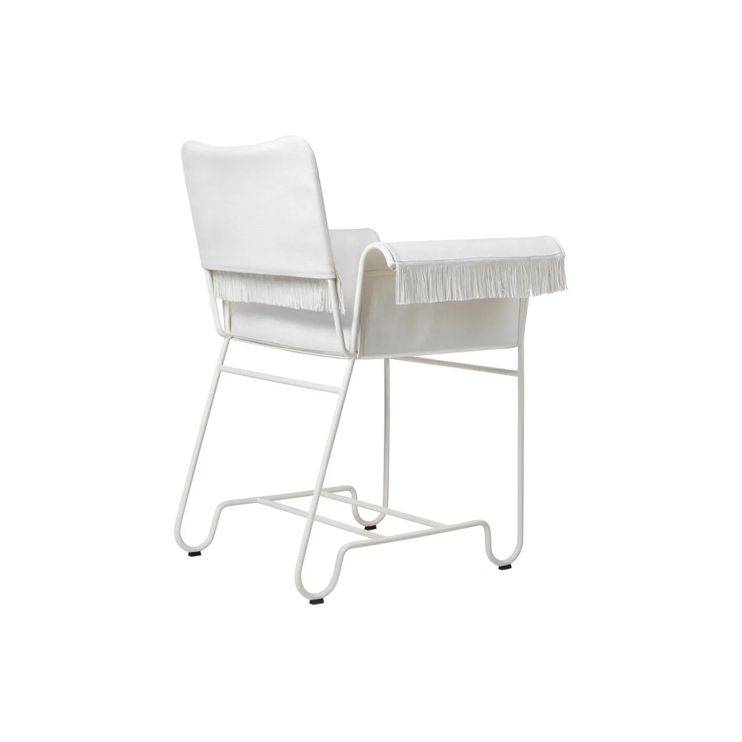Tropique Dining Chair with Fringes i Udine Limonta 06 white tekstil, hvide frynser og stel i lakeret rustfrit stål fra GUBI. Farve: Udine Limonta 06/classic white. Mål: H: 86 x B: 71 x D: 58 cm. Siddehøjde: 45 cm. Design: Mathieu Matégot.