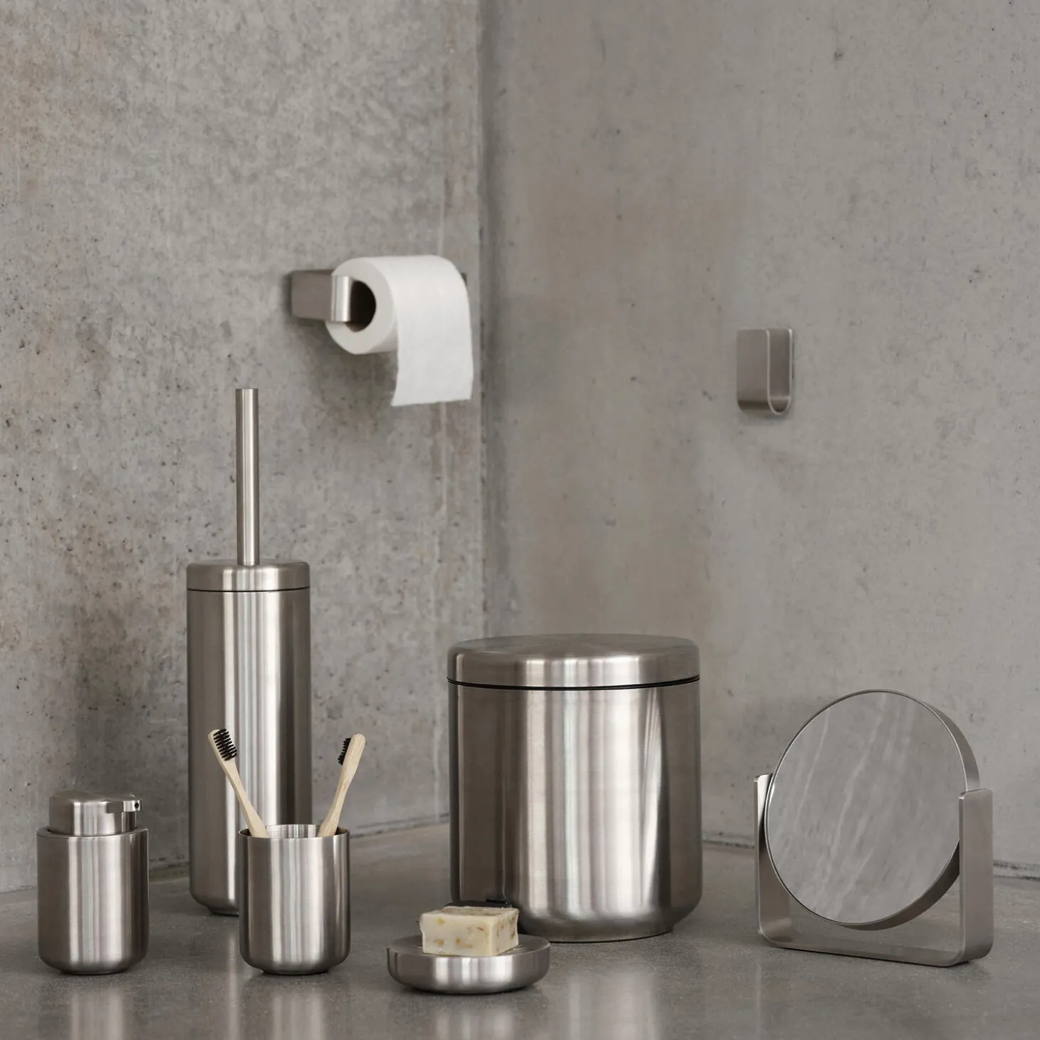 UME-serien har i flere år været et centralt ikon i Zones badkollektion. Nu udkommer serien i et eksklusivt nyt materiale, nemlig mat stål. Et oplagt valg til badeværelser og toiletter alle steder, hvor funktion og æstetik er i højsædet. De bløde organiske former får smukt modspil fra det stilrene og kølige stål i serien, som er skabt i samarbejde med designteamet VE2. I gulvhøjde byder serien på en mindre pedelspand samt toiletbørste i cylinderformet holder. Til væggen er der matchende toiletrulleholder samt kroge i elegant u-form med skjulte beslag. Til bordet findes både sæbedispenser, sæbeskål samt tandbørstekrus samt rundt bordspejl med vippefunktion. På trods af stålets mathed reflekterer lyset sig smukt i overfladen og giver overfladen liv og karaktér. Alt i alt en formfuldendt forvandling af en ægte Zone-klassiker.