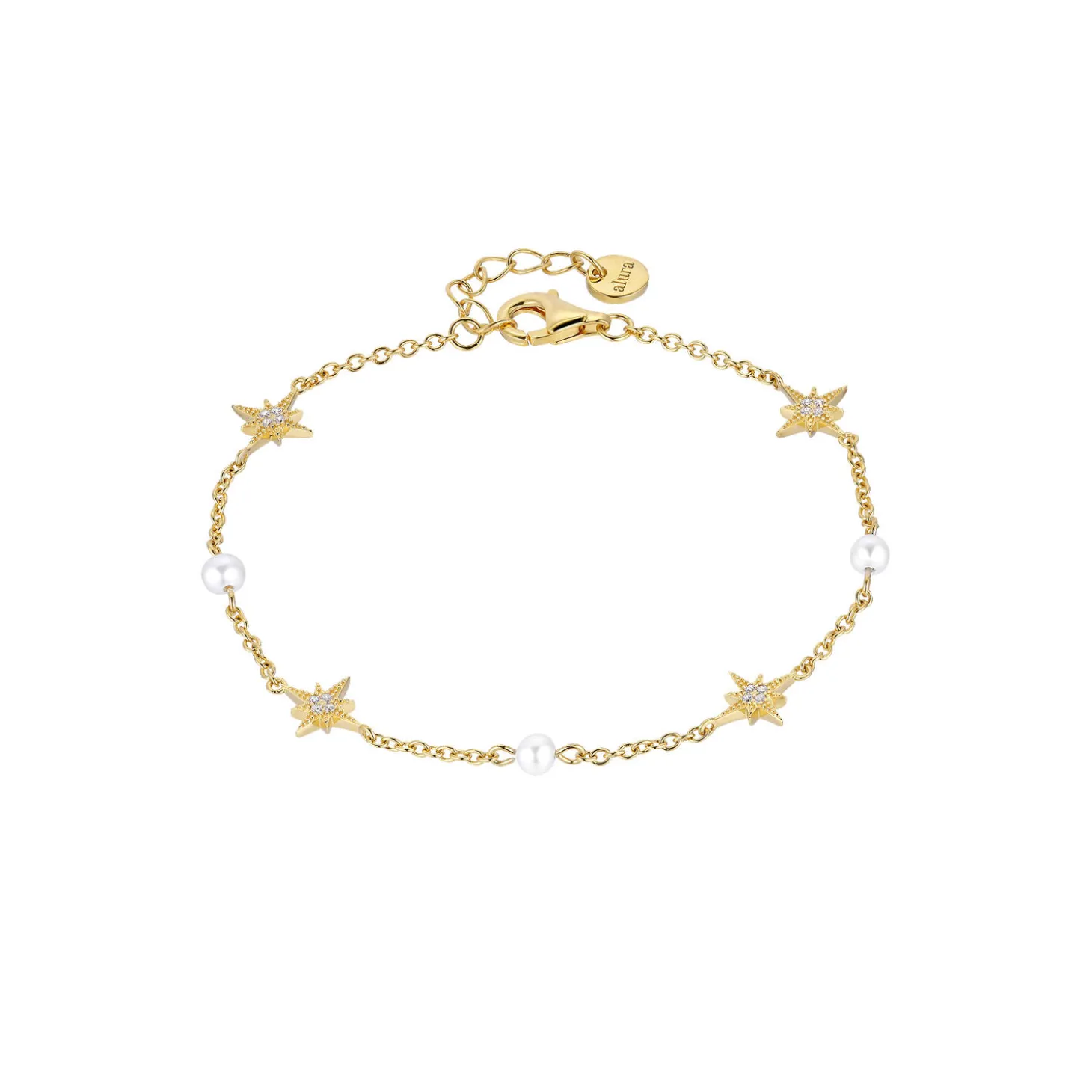 Armbånd med 8 takket stjerner med små cubic zirkoner og ferskvandsperler. Opbevares i lufttæt pose.