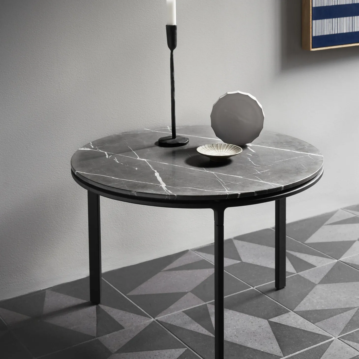 The Vipp coffee table is a versatile table for the living room. This table features a three-legged frame of black powder-coated aluminium and a tabletop of either polished marble or dark oak.
