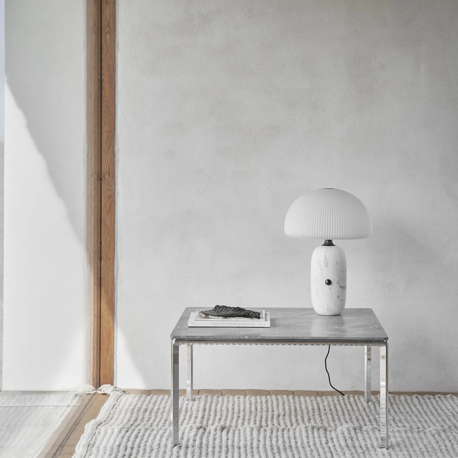 The coffee tables feature a four-legged frame of polished aluminium and a hovering tabletop of marble. Available in two sizes and with two different marble variants, the mix of organic stoneware contrasts the hardiness of the frame.The coffee tables can be displayed in solitary or paired for a complete coffee table composition. Use the smaller coffee table as a side table for either the Vipp610 Loft sofa or the Vipp632 Chimney sofa.