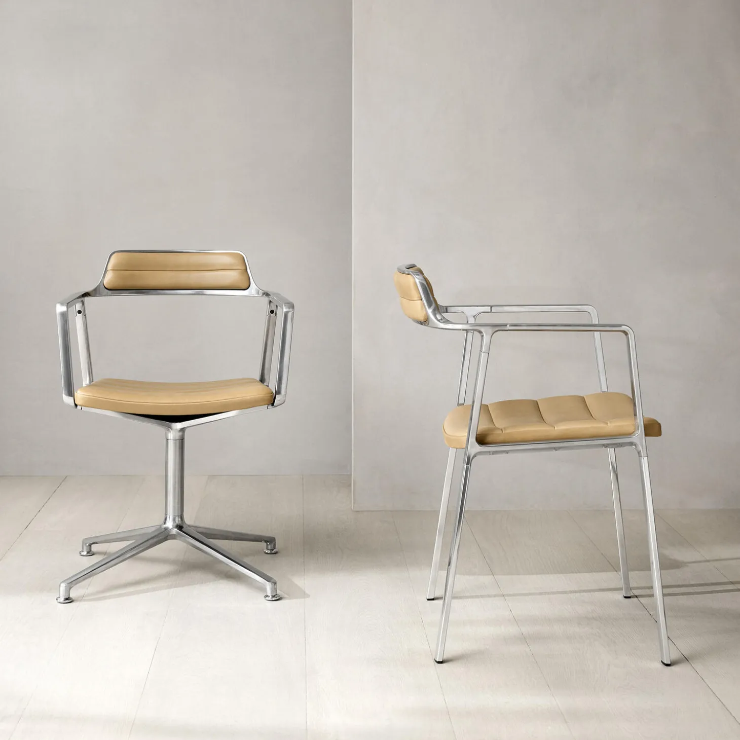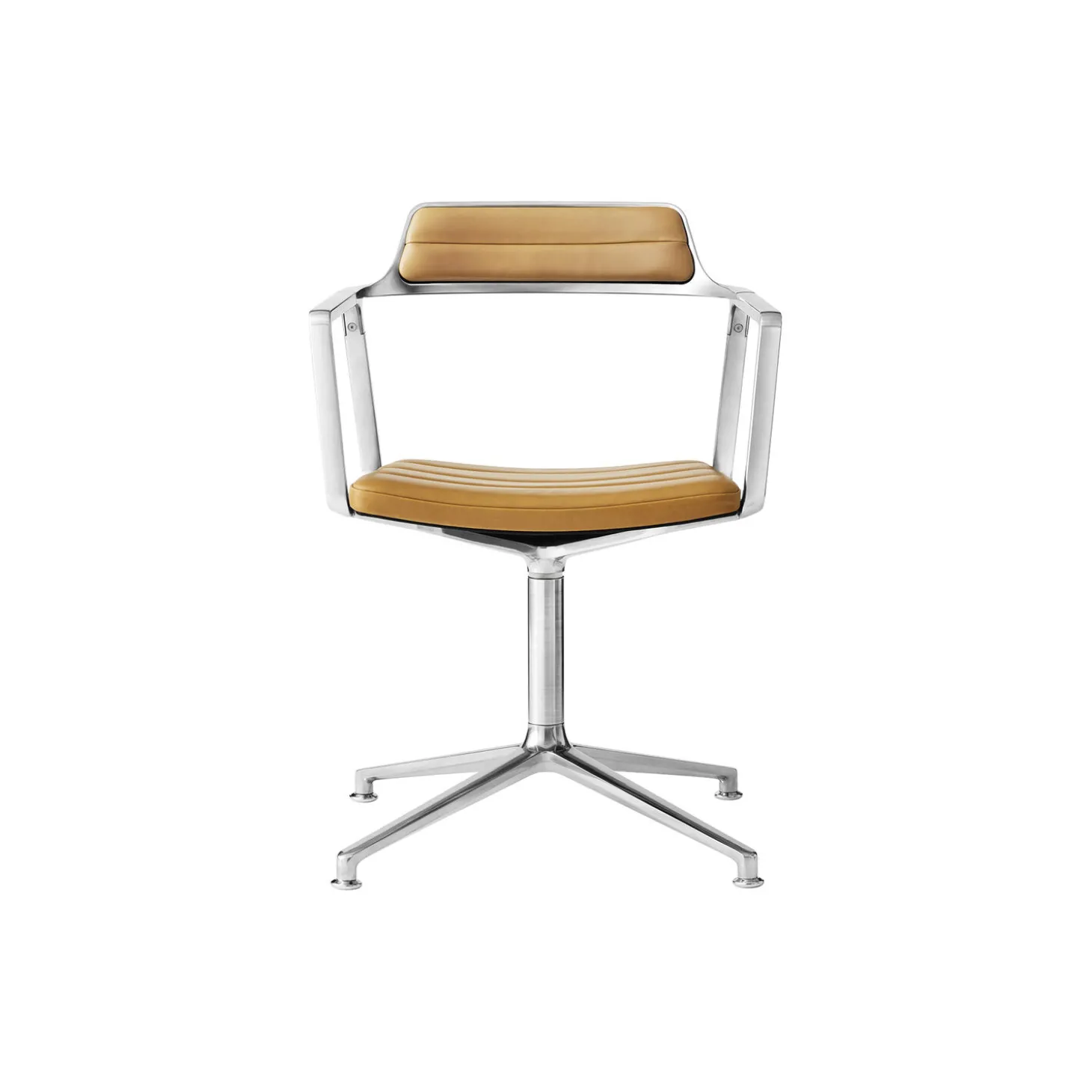 Vipp Swivel chair is suitable for the home office, around the dining table or meeting room. The chair features a polished or powder-coated aluminium frame with an upholstered leather seat and backrest. A four-legged base on floor gliders allows for a 360° seat rotation. Also available with castors. The upholstery of black and sand leather features unique visual characteristics.