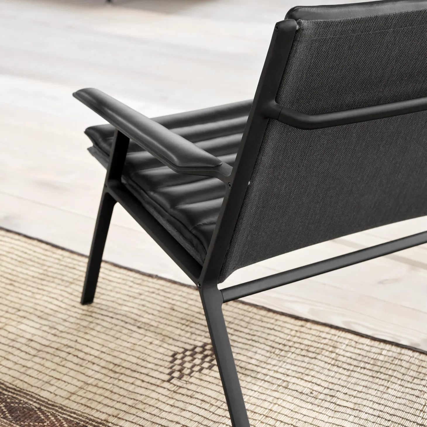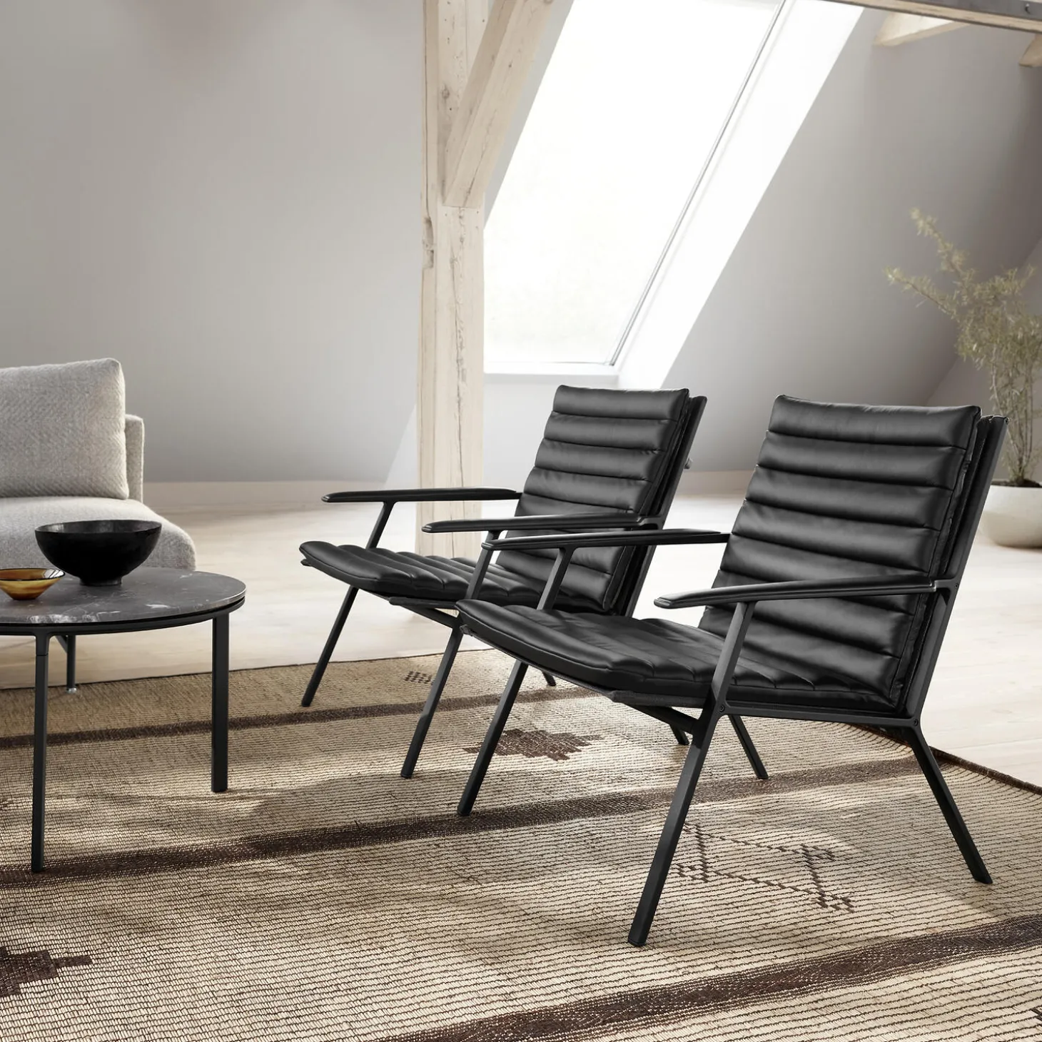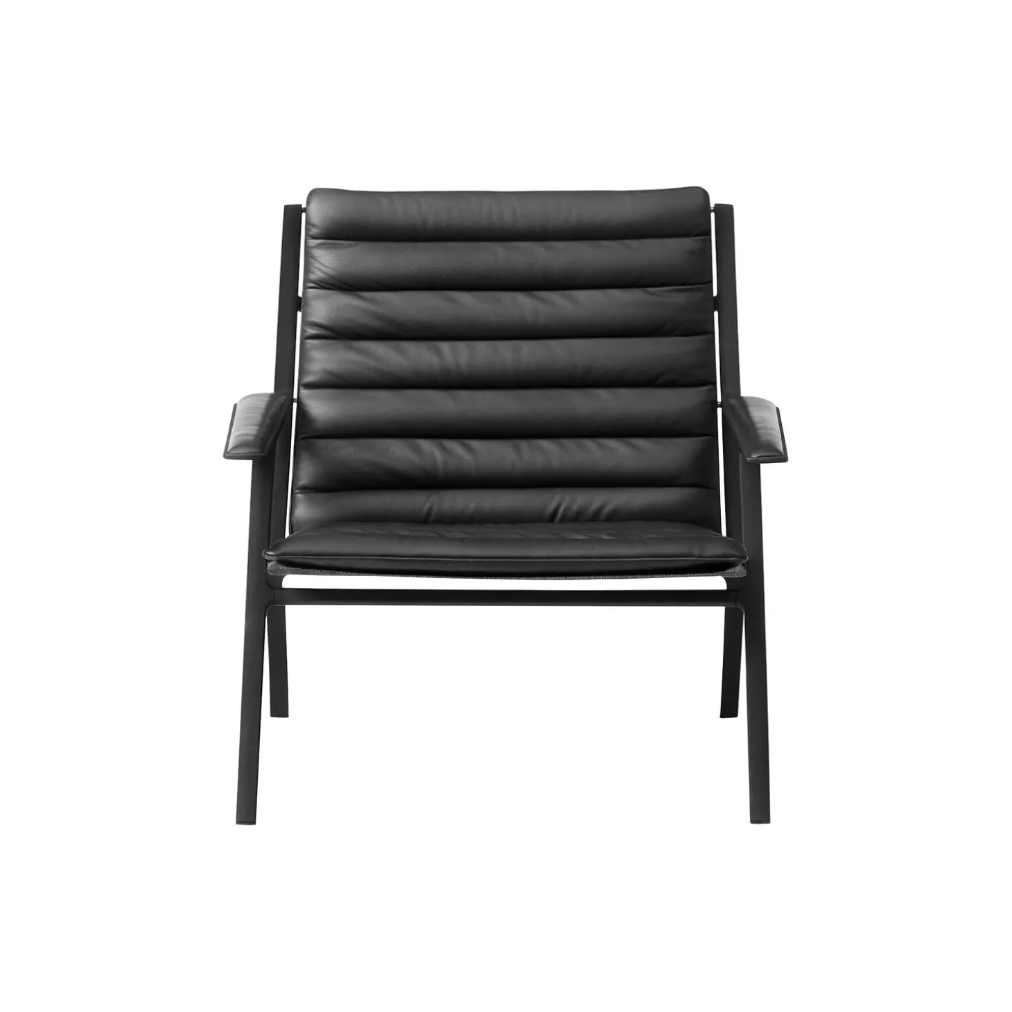 Vipp lenestolen er velegnet til stuen eller læsekrogen. Stolen har en pulverlakeret aluminiumsramme med polstrede armlæn og et skråt vinklet sæde og ryglæn. Afrundede hjørner og det taktile, sorte læderbetræk tilfører blødhed til den robuste konstruktion. Bemærk at læderet har unikke særtræk.