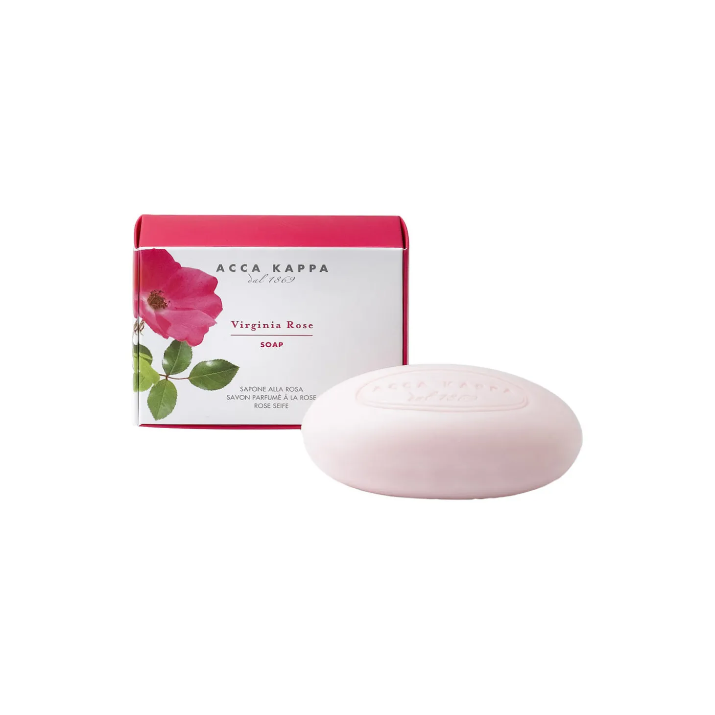 Virginia Rose sæbe lavet på vegetabilske palme- kokosplanteolier fra Acca Kappa. Duft: rose. Indeholder: 150 g.