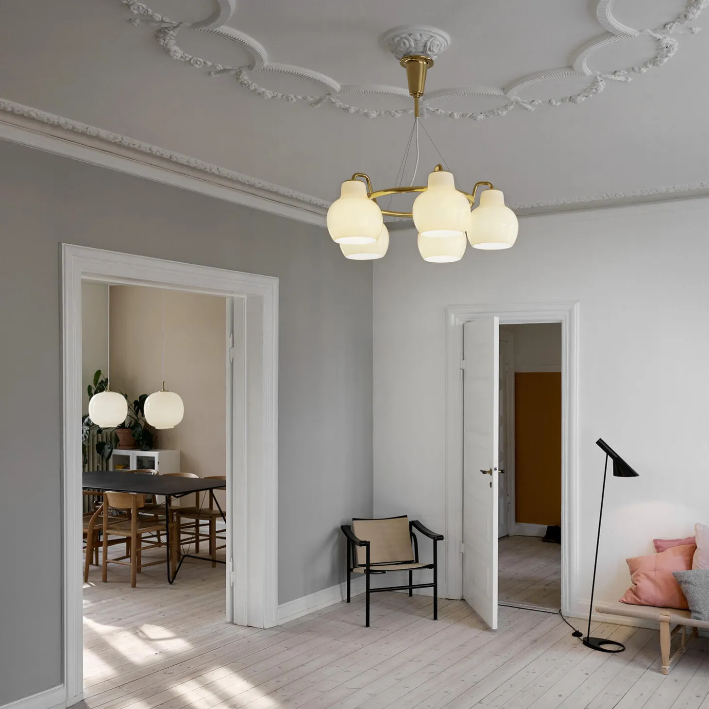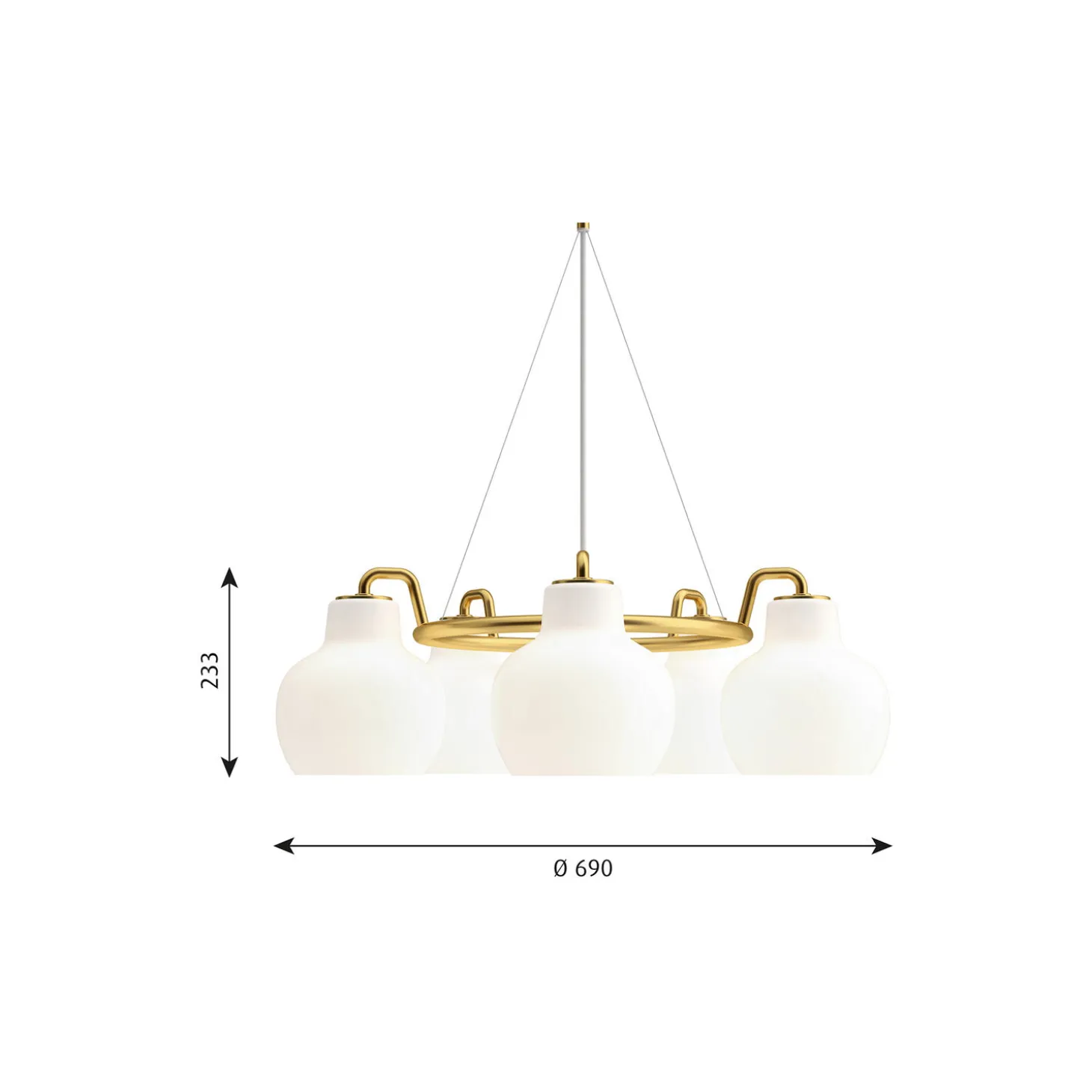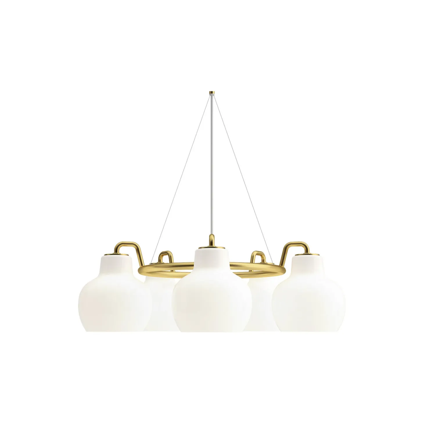 VL Ringkrone 5 i mundblæst trelags opalglas og ubehandlet børstet messing fra Louis Poulsen. Farve: opal. Mål: H: 23,3 x Ø 69 cm. Lyskilde: maks. 60W E27. Design: Vilhelm Lauritzen.