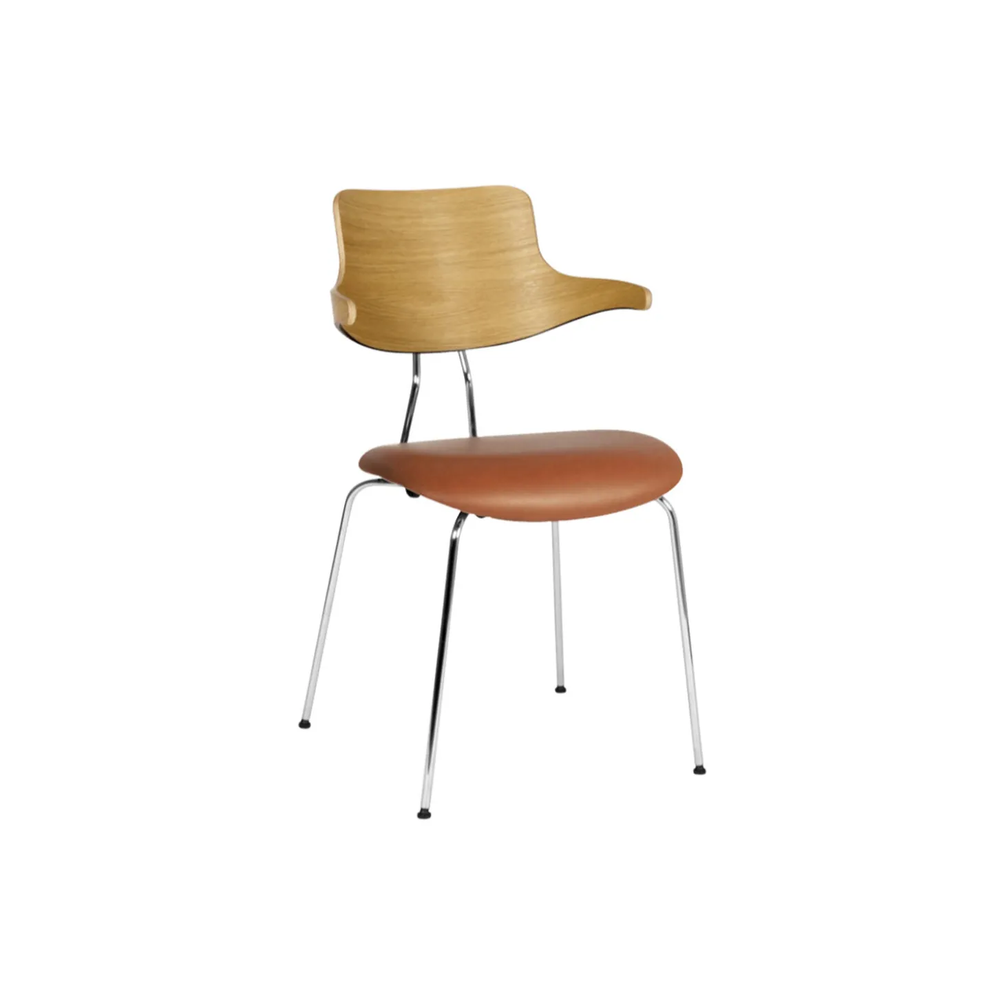 - Materiale: ryg af eg, sædepolstring i Ultra 41574 brandy læder af Sørensen Leather og stel i krom højstyrkestål