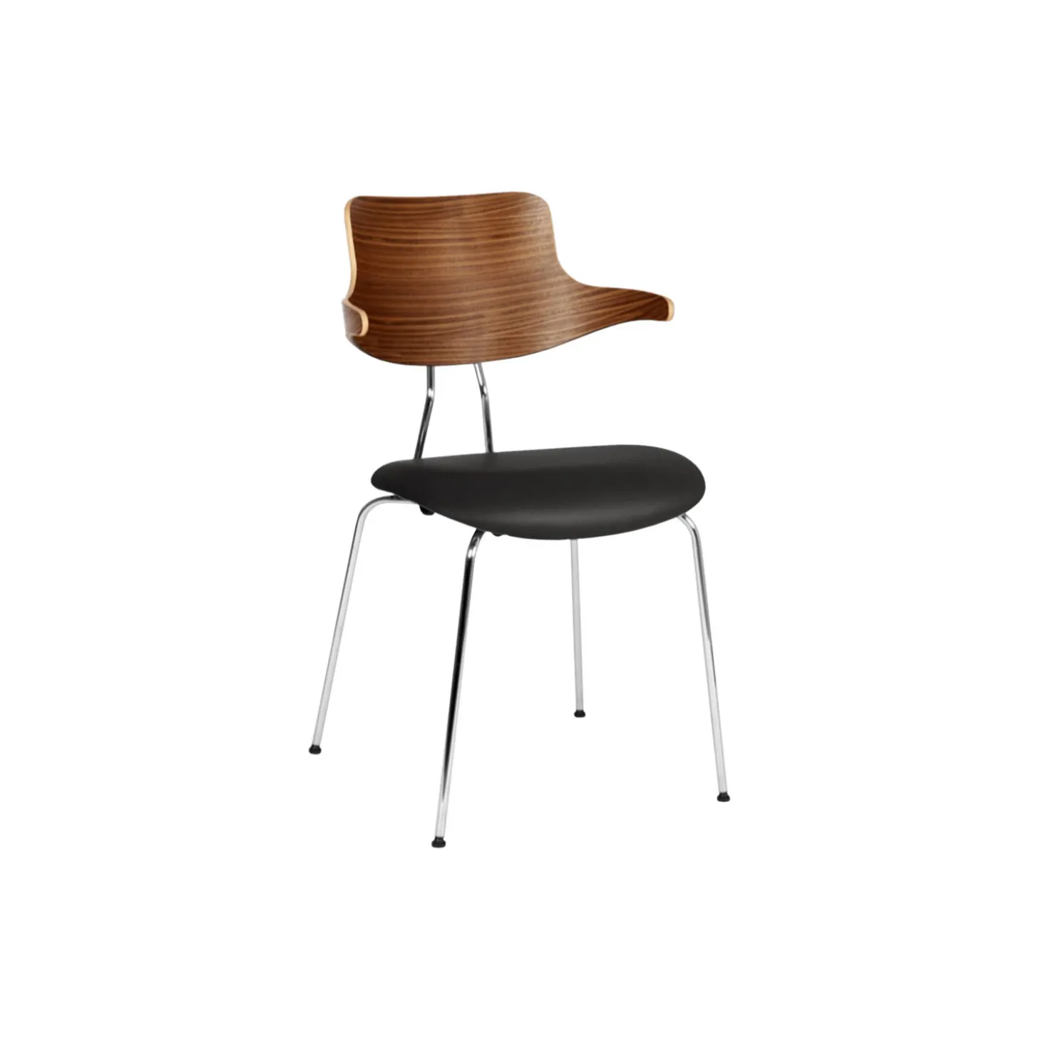 - Materiale: ryg af valnød, sædepolstring i Ultra 41599 sort læder af Sørensen Leather og stel i krom højstyrkestål