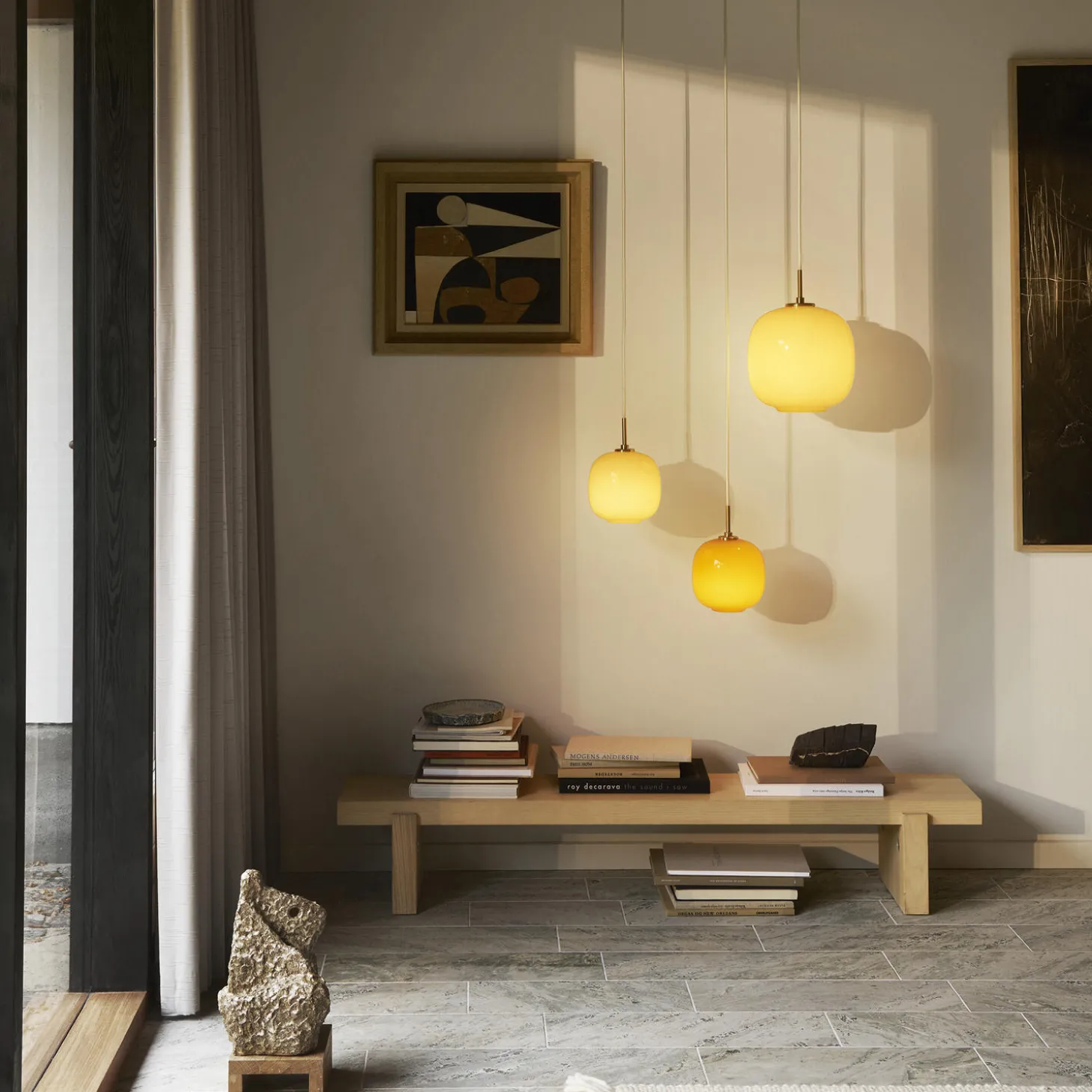 - Materiale: Mundblæst blankt opalglas i hvid, glas i farven Pale Rose, Pale Yellow eller Amber. Børstet messing, ubehandlet. Bemærk, at intensiteten i det farvede glas kan variere.