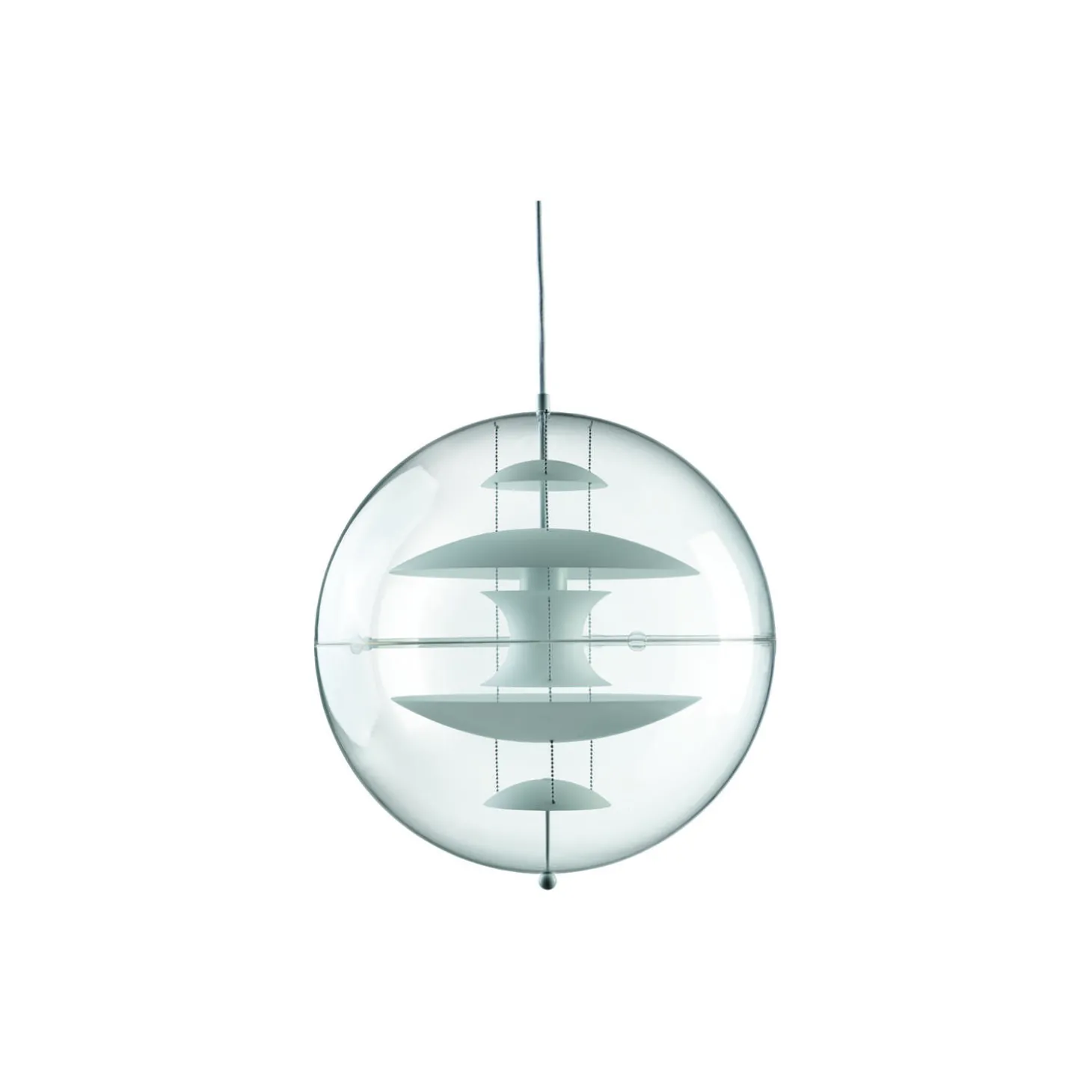 VP Globe pendel med top- og bundskive i aluminium, skiver i glas og skærm i akryl fra Verpan. Farve: skærm: klar, skiver: hvid. Mål: Ø 40 cm. Lyskilde: maks. 60W E14. Design: Verner Panton.