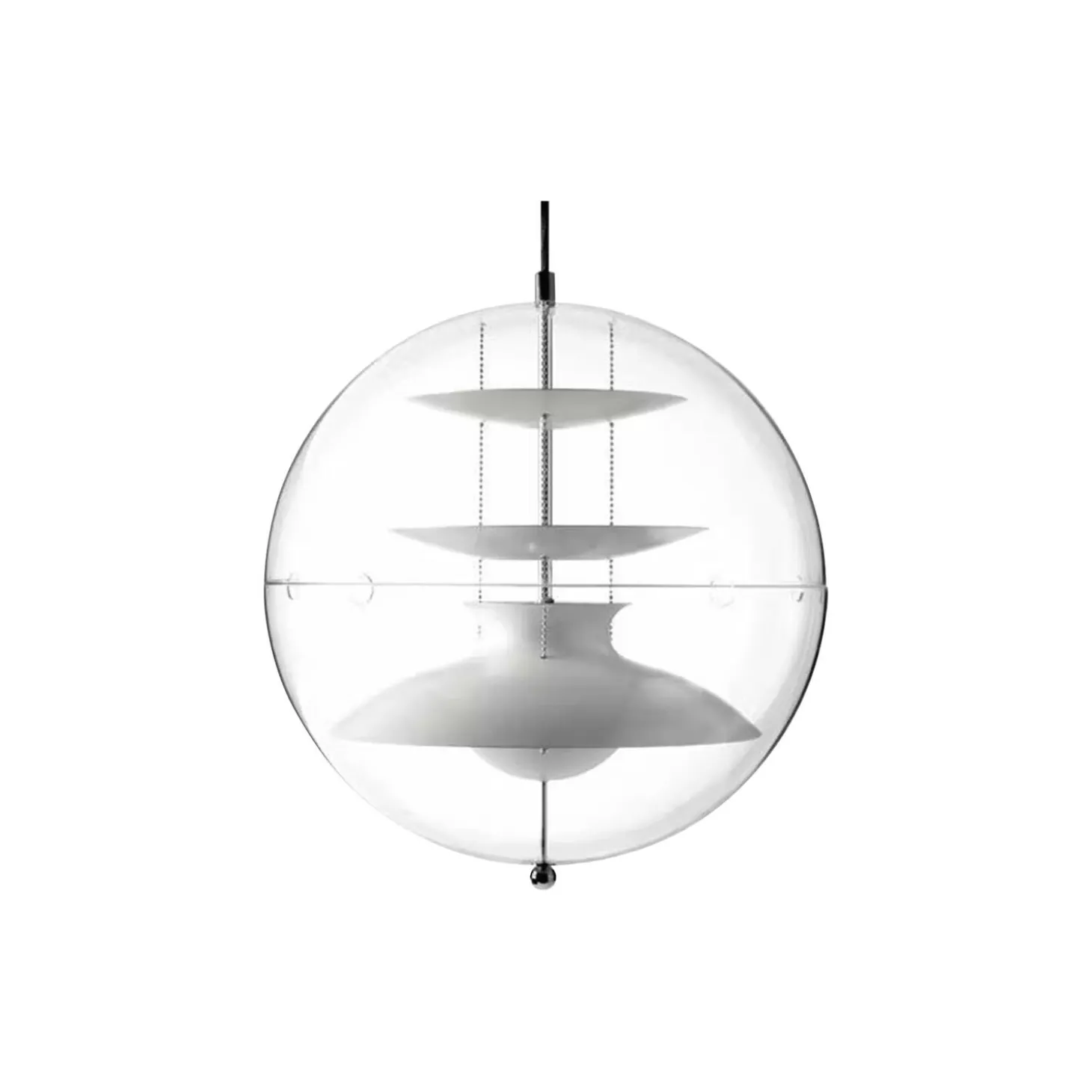 Et dekorativt vedhæng med en ydre kugle i krystalklar, transparent akryl med fire hvide reflekser ophængt i tre stålkæder. Det hvide brydes kun af et lille stænk rødt, som kun er synligt fra undersiden af vedhænget. Et klassisk Panton-touch.