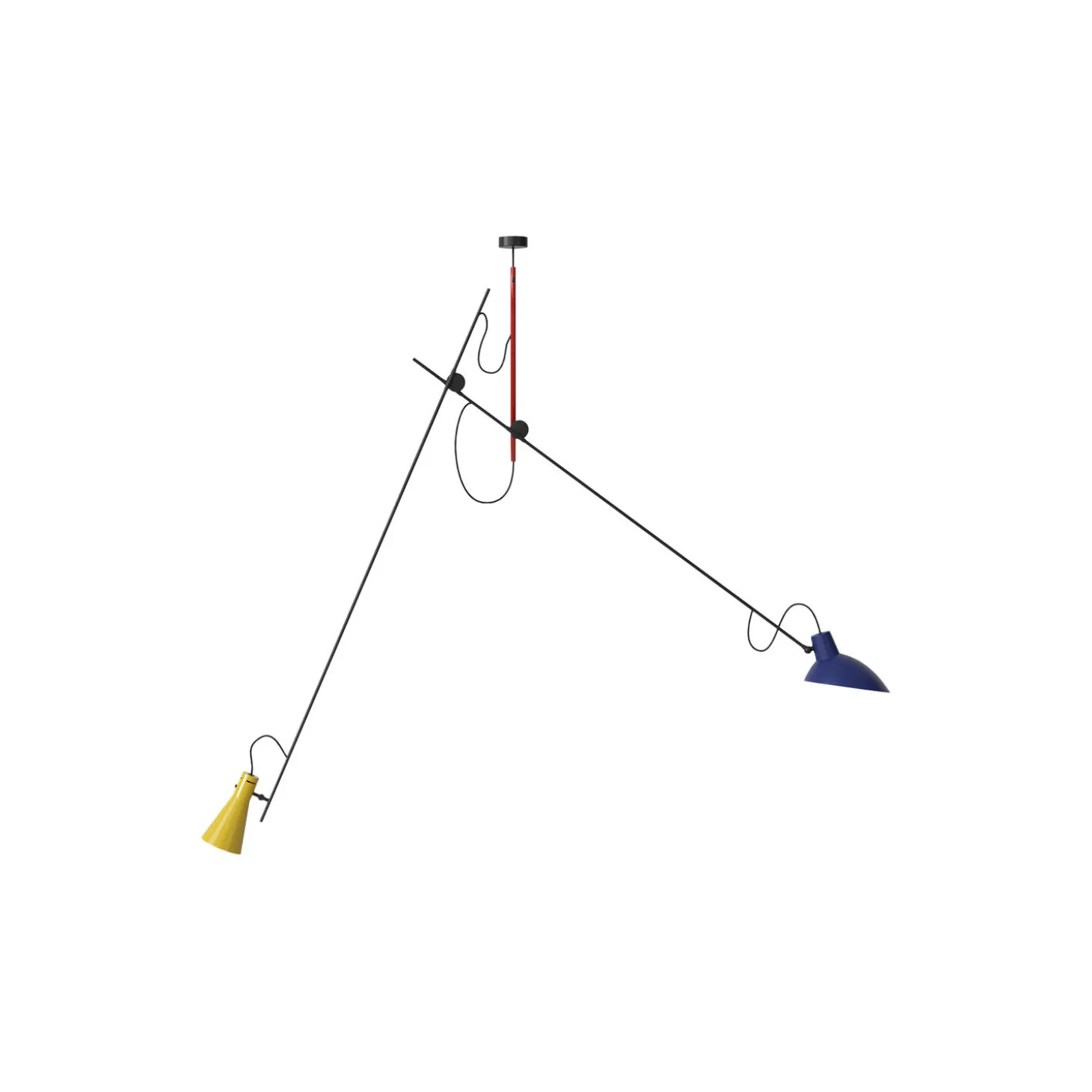 VV Cinquanta Suspension in spun aluminium and steel from Astep. Colour: blue/yellow/mondrian. Dimensions: H: 180 x W: 25 x D: 190 cm. Light Source: 2 x 7W LED (max. 53W) E27. Design: Vittoriano Viganò. Complimentary bulb included. The VV Cinquanta Suspension is elegant and versatile with two posable direct light sources. With a distinctive dual-stemmed construction, it is a type of kinetic object constructed to take advantage of the principle of equilibrium. Therefore the central pole might find its equilibrium in a way which is not perpendicular to the ceiling. The fixture and the reflectors can be adjusted to many different positions, enabling a wide variety of both downward and upward lighting at the same time. The invitingly playful design encourages dynamic lighting compositions. The VV Cinquanta reflectors are made of enameled spun aluminium, available in original Vittoriano Viganò colors.