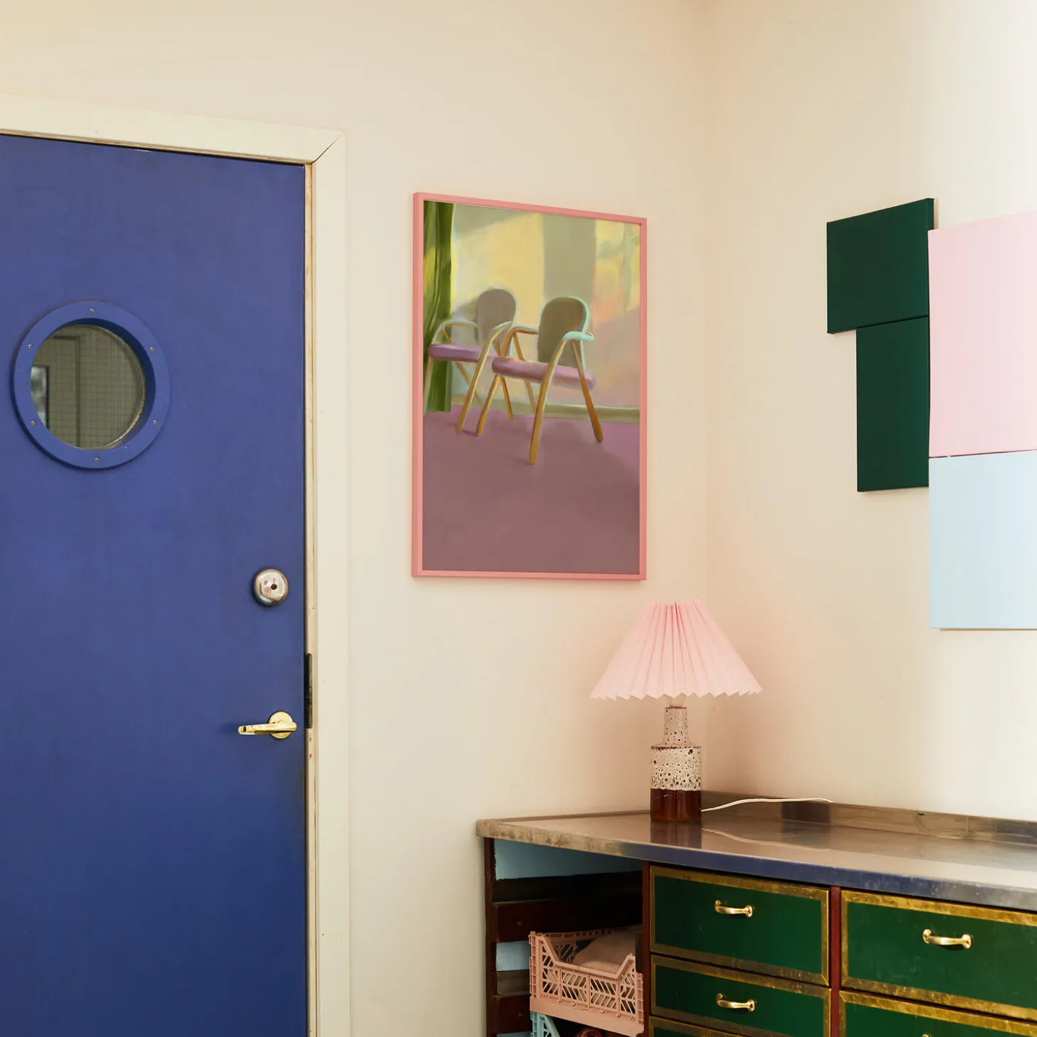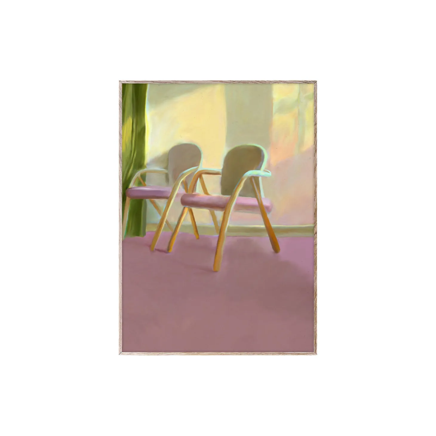Waiting Room by Danish art group Misfitting Things aims to transform the mundane into the dreamlike. Created through digital painting techniques, the composition features a set of simple chairs in soft tones. The streaming light coming into the space allows a sense of warmth and wonder to enter the composition, with the warm tones of pink and beige punctuated by a single green curtain. Frame not included.