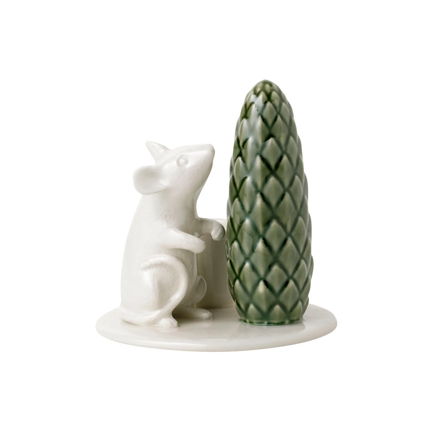 Lysestage med en lille mus der sultent kigger på den store kogle ved dens side, overvældet af mængden af mad og klar til at gå i gang med sit festmåltid. Winter Stories er små magiske fortællinger om nordens særlige lys og landskab. De bringer varme og hygge til de mørke vinterdage. Brug kronelys.