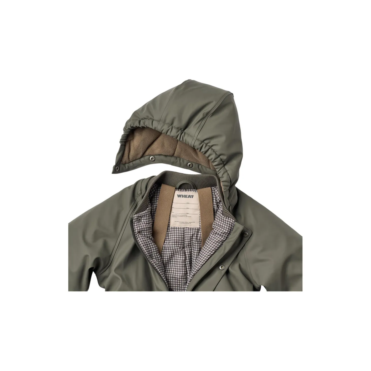 The essential wintersuit for the junior child is breathable, waterproof and warm, as it’s the perfect combination between a rainsuit and snowsuit. – Regular fit- Detachable and adjustable hood – Elastic suspenders- Pockets with press buttons- Hidden zipper down the front- Detachable rubber strap under the feet- Wind cuffs with elastics at the sleeves- Elastics at the leg hems- ReflectorsWheat’s wintersuits are the perfect mixture between Wheat’s rainsuit and snowsuit. This suit has a heavier winter padding, which makes it warm on even the coldest and wettest winter days. The wintersuit is made in breathable polyurethane (PU) material and is therefore unique, as it can keep your child both dry and warm. —Waterproof: 9.000 mmBreathability: 600 g/m2/24 hStandard 100 by OEKO-TEX®PFC-freeFlourine-free Waterproof zipper Welded seams—Shell fabric: 100% Recycled polyester with breathable polyurethane coatingPadding: 100% Recycled polyesterLining: 100% Recycled polyester